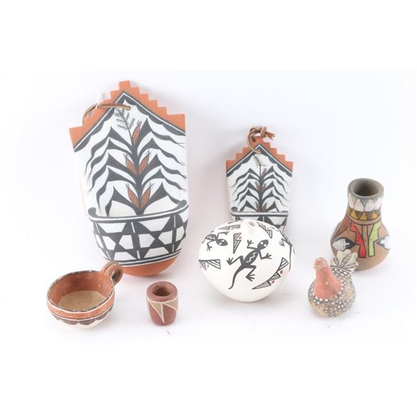 (1) Beautifully painted Santo Domingo wall hanger, maker marked, measures 9" by 5", 3" deep, leather strap for hanging. (1) Beautiful small Santo Domingo wall hanger, measures 5 1/2" by 3", 2" deep, leather strap for hanging. (1) San Pedro white lizard pot, broken stem, measures 3 1/2" tall by 4 1/2" across. (1) Small jar pot measures 4" by 1 1/2". (1) Small chicken effigy with chip off top of head and beak, 3" tall by 3 1/4" long. (1) small handled cup, has chips, measures 3 1/4" x 1 1/2". (1) Tiny cup 1" x 1 1/2".