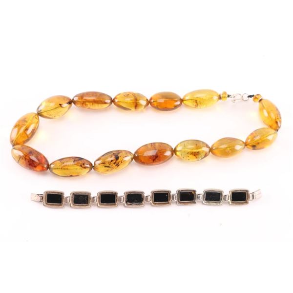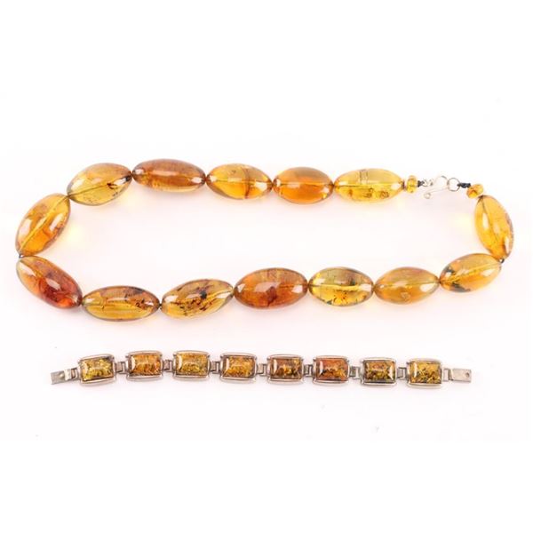 (1) 1 1/4" amber bead necklace with fish hook clasp, measures 9" from drop.(1) Amber bracelet set in sterling silver, measures 7 1/2" end to end.