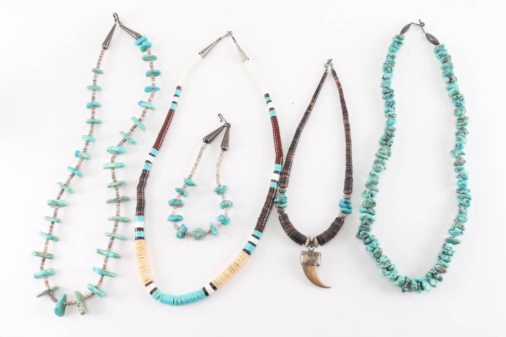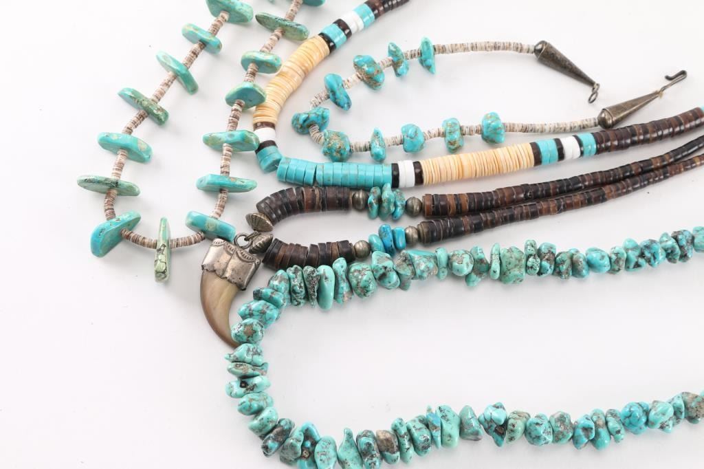 (1) Nugget turquoise beaded necklace.(1) Bone heishi necklace with bear claw pendant.(1) Multi colored heishi necklace.(1) Turquoise and heishi necklace.(1) Childs turquoise nugget necklace.