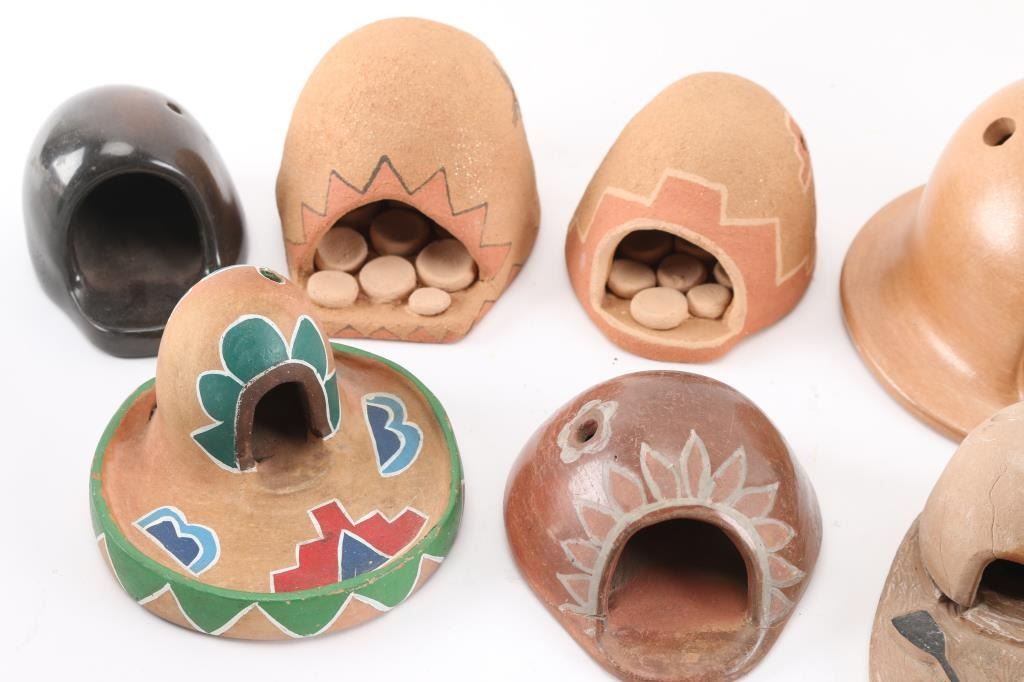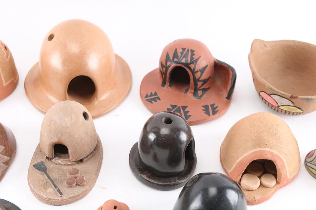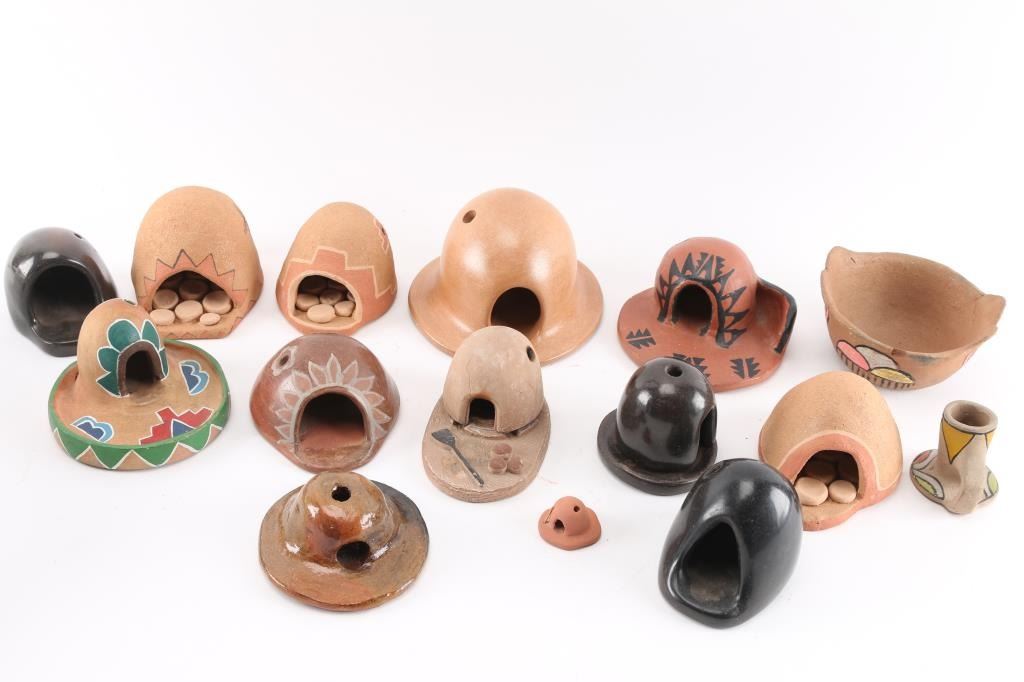 (12) Clay ovens of various sizes and designs, some blackware, some glazed, some painted. (1) Small candle holder. (1) Small brightly painted bowl.
