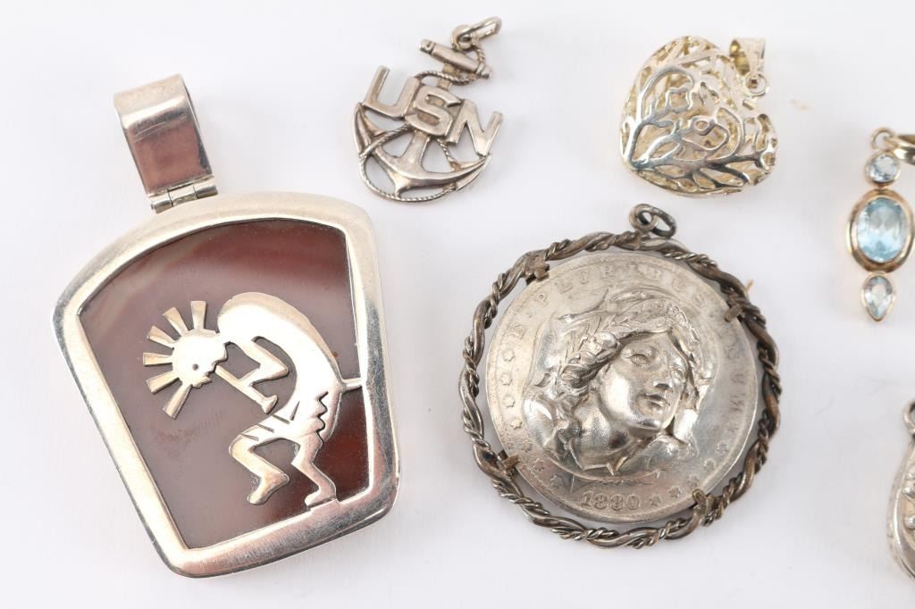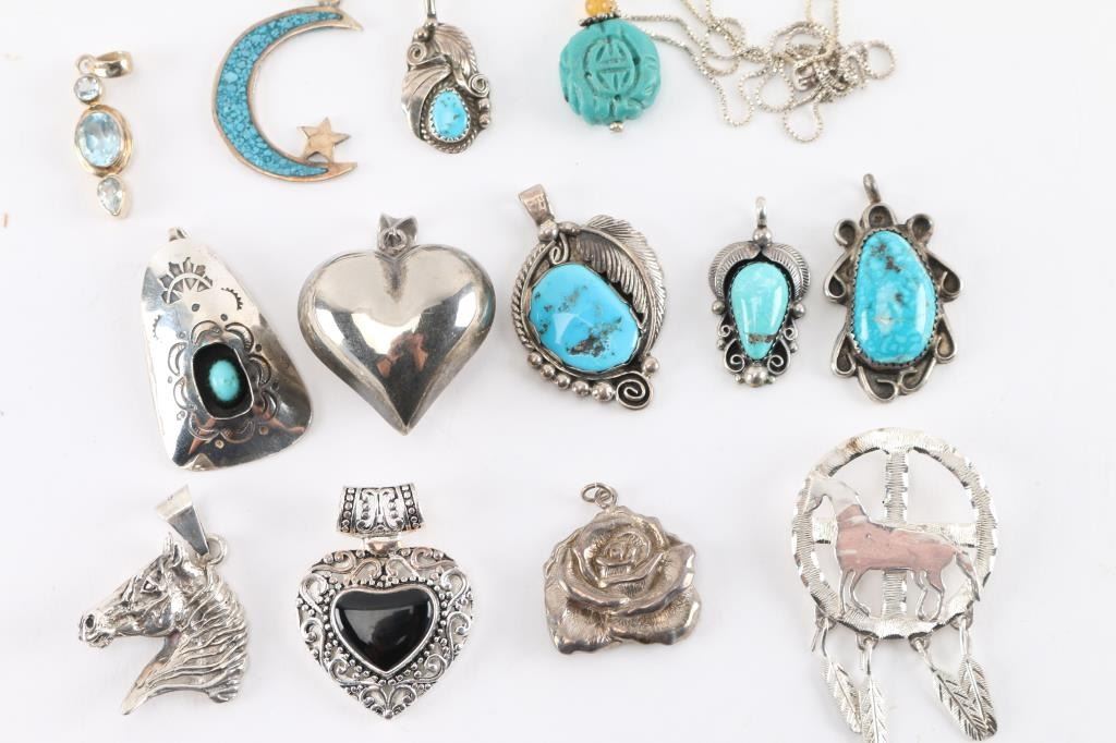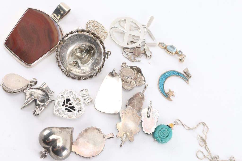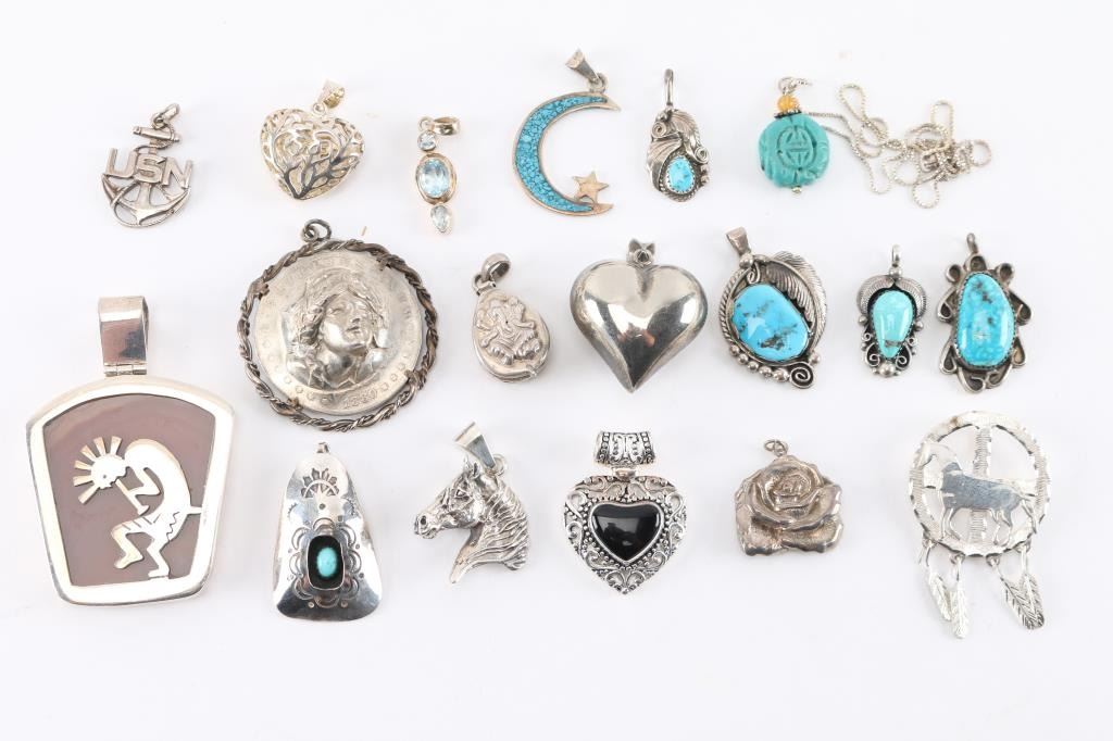 (1) Sterling silver chain with pendant, measuring 10" from drop. (17) Pendants, some sterling, some turquoise, various designs and styles.