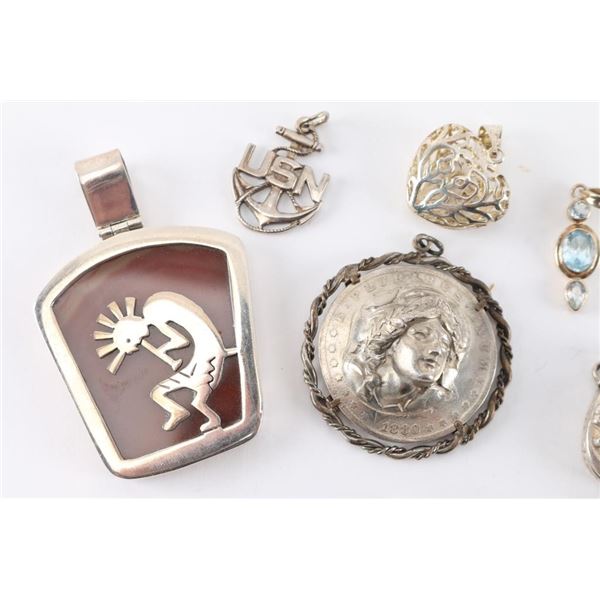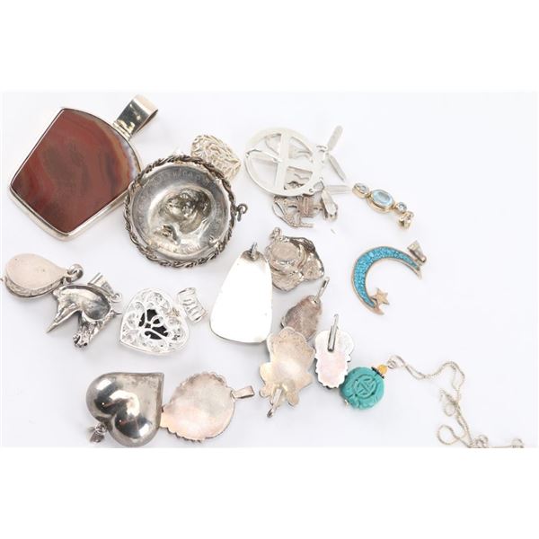(1) Sterling silver chain with pendant, measuring 10" from drop. (17) Pendants, some sterling, some turquoise, various designs and styles.