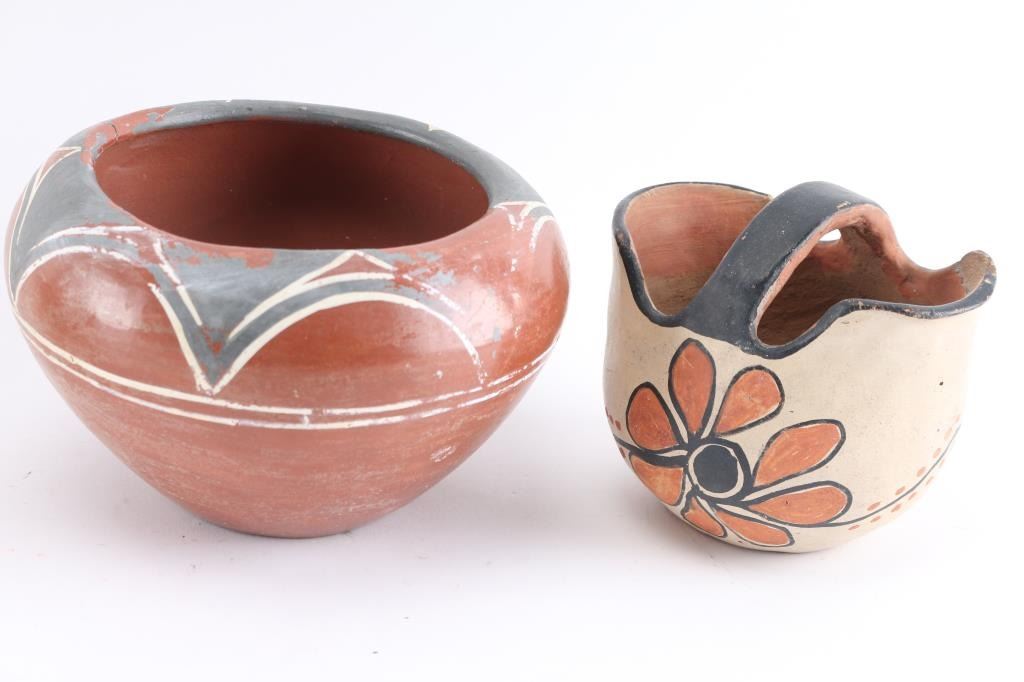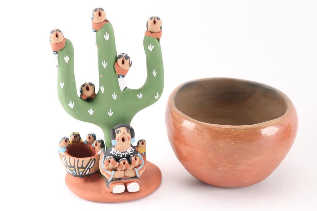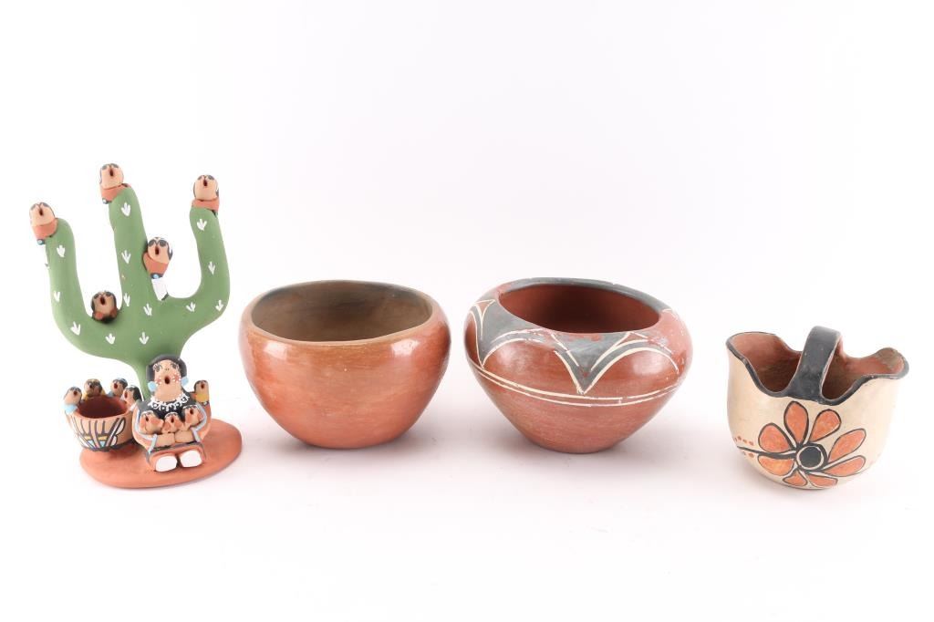 (1) Sweet Storyteller Cactus, signed on bottom, measuring 8 1/2" tall by 5" around. (2) Redware pots, one with gray and white paint has 2" crack at rim, unsigned, and one is signed Caroline Rosetta on bottom. (1) Handled basket pot with 1/2" chip on inside, painted flowers, measures 5" x 3".