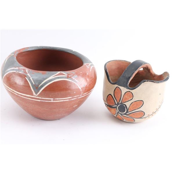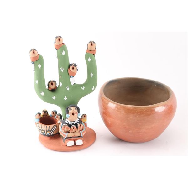 (1) Sweet Storyteller Cactus, signed on bottom, measuring 8 1/2" tall by 5" around. (2) Redware pots, one with gray and white paint has 2" crack at rim, unsigned, and one is signed Caroline Rosetta on bottom. (1) Handled basket pot with 1/2" chip on inside, painted flowers, measures 5" x 3".