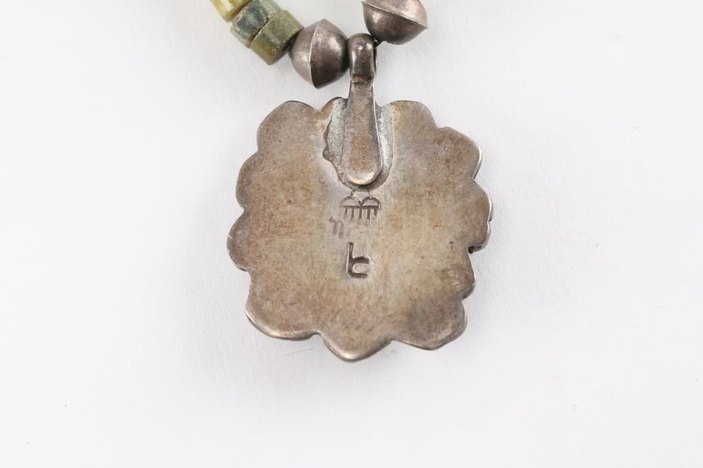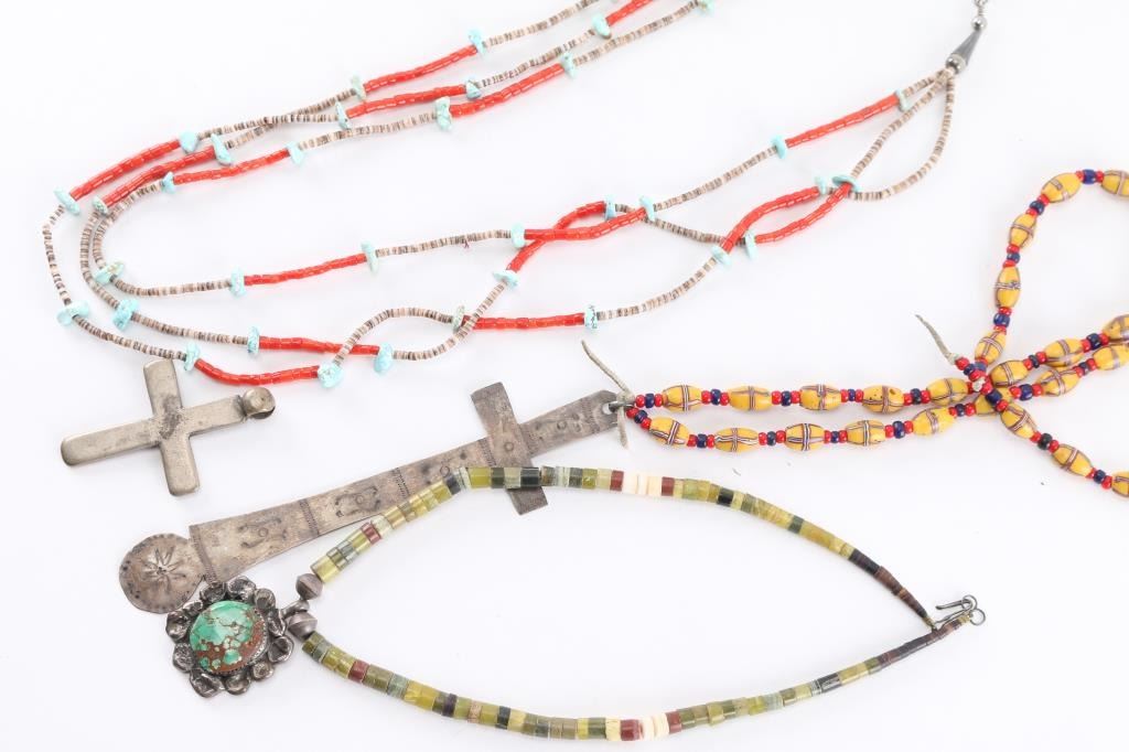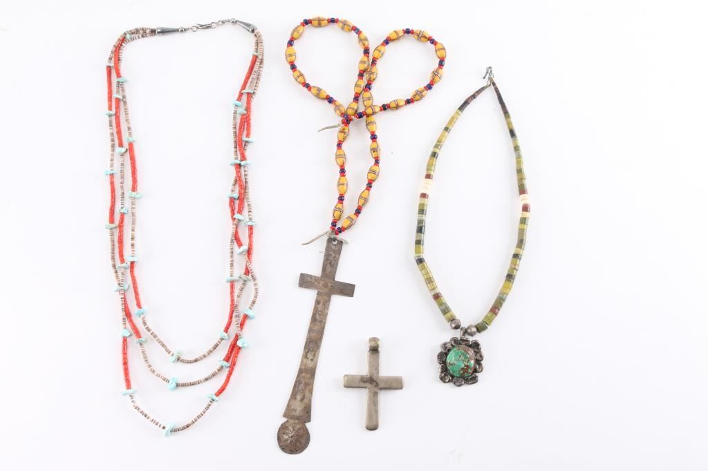(1) Indian glass trade bead necklace with sterling cross pendant; (1) Indian coral and turquoise two-strand necklace; (1) Indian choker necklace with turquoise and sterling pendant; (1) Silver colored metal cross pendant shows age.