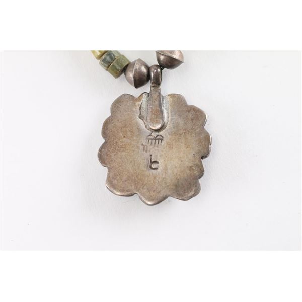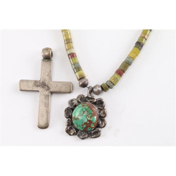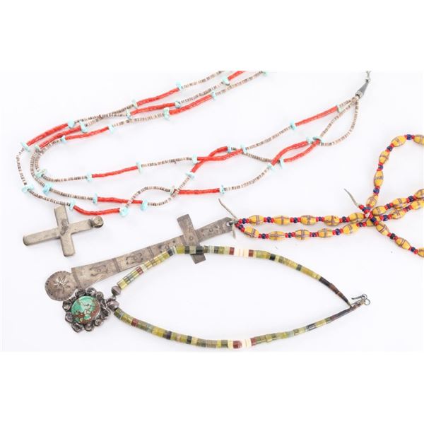 (1) Indian glass trade bead necklace with sterling cross pendant; (1) Indian coral and turquoise two-strand necklace; (1) Indian choker necklace with turquoise and sterling pendant; (1) Silver colored metal cross pendant shows age.