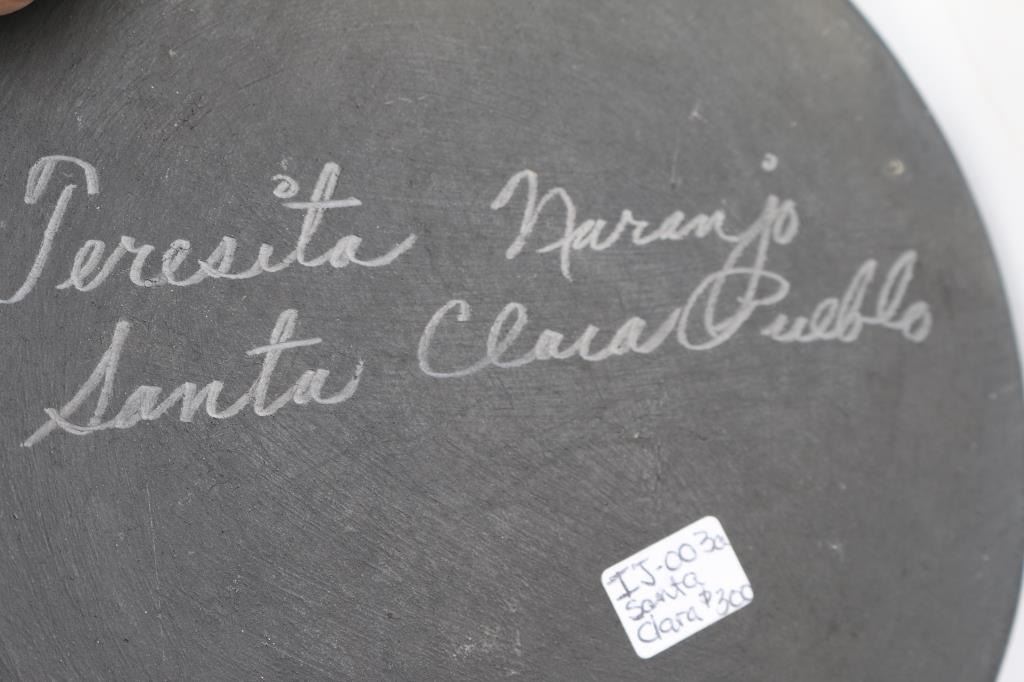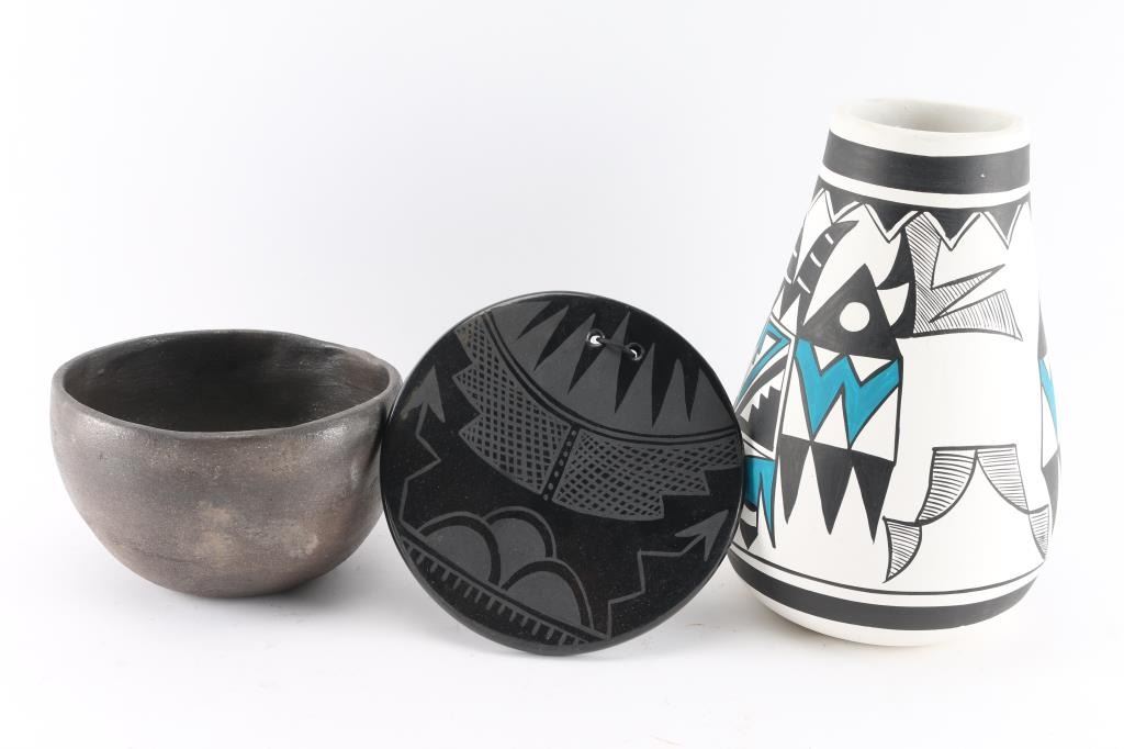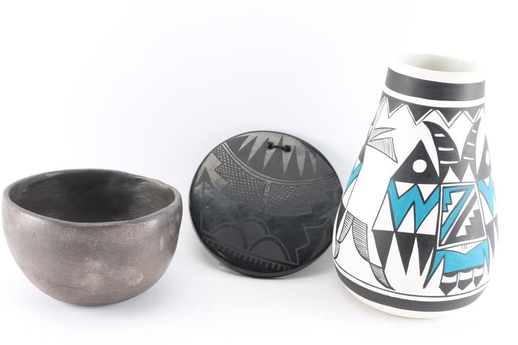 (1) Black and blue painted white vase, signed on bottom, measuring 10" by 3 1/2"; (1) black glazed bowl, measuring 4" by 6 1/4"; (1) Santa Clara Pueblo backware wall hanging signed Teresito Narenjo, measuring 6 1/2" around. All in excellent condition.