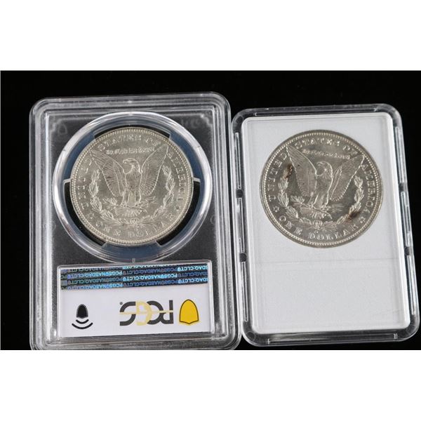 Includes: (1) 1904-O Morgan Silver Dollar, PCGS Grade MS63. (1) 1881-O Morgan Silver Dollar, Handwritten "Gem BU". (Not Professionally Graded).