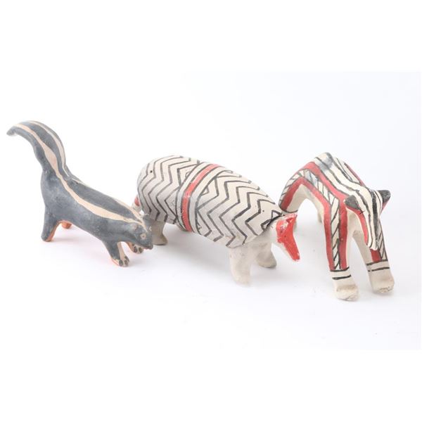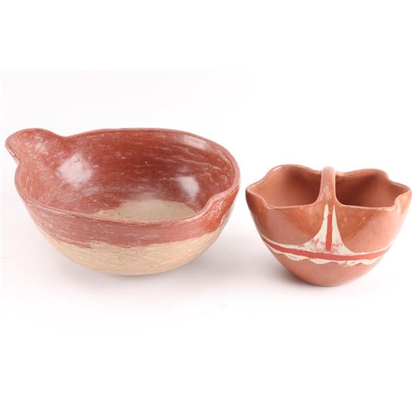 (1) Large bowl and pitcher with red paint, measures 9" x 8" x 3 1/4" tall. Has 5" crack from rim on one side, repaired. (1) Redware handled bowl, 6" x 3 1/2" x 3 1/4".Clay armadillo, skunk and dog, measuring 6", 5 1/2" and 4 1/2", respectively, and approx 2 12" tall.