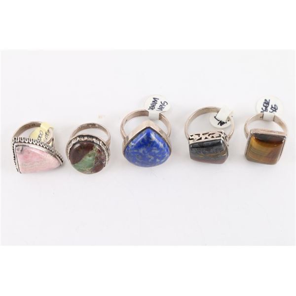 (1) Rhodochrosite, side triangle shape, size 7. (1) Denim Lapis, large teardrop, size 9. (1) Tiger Eye, square, size 6 1/2". (1) Unknown, oval shape, size 6 1/2. (1) Tiger iron, size 9. All set in sterling silver.