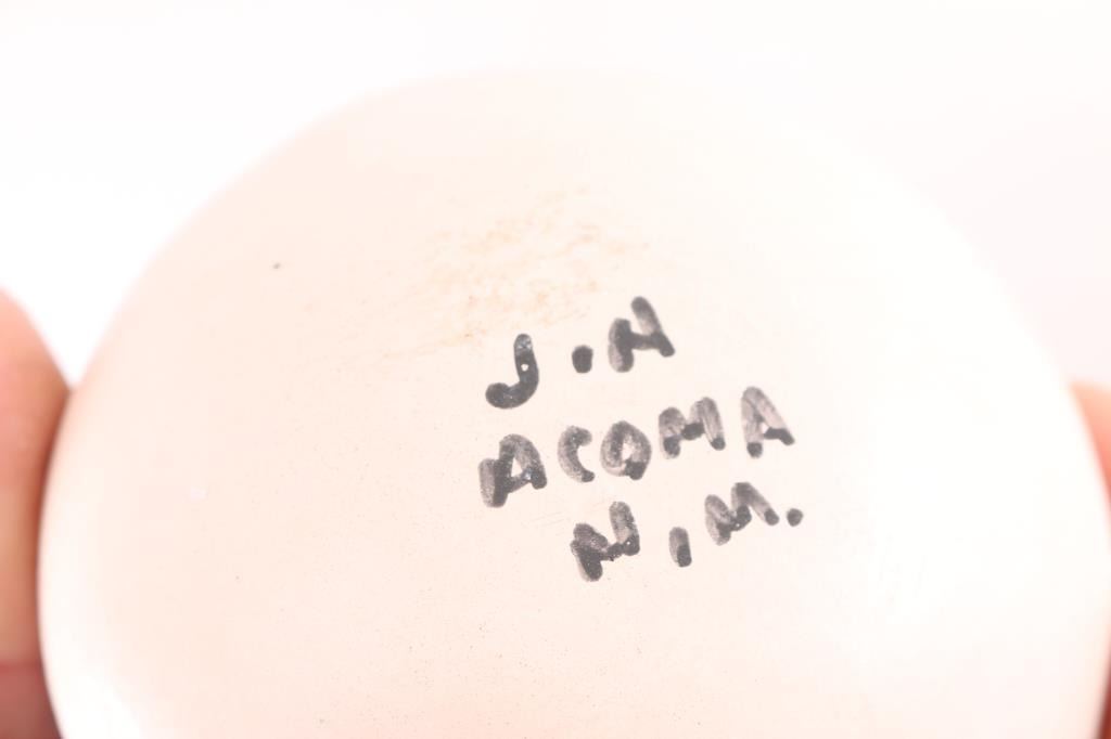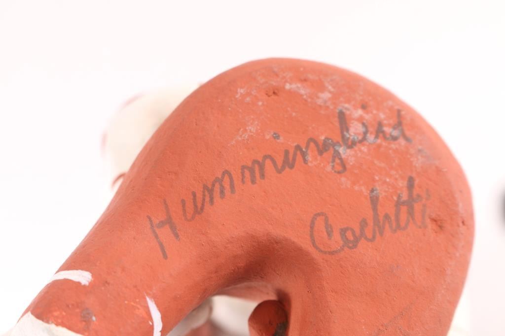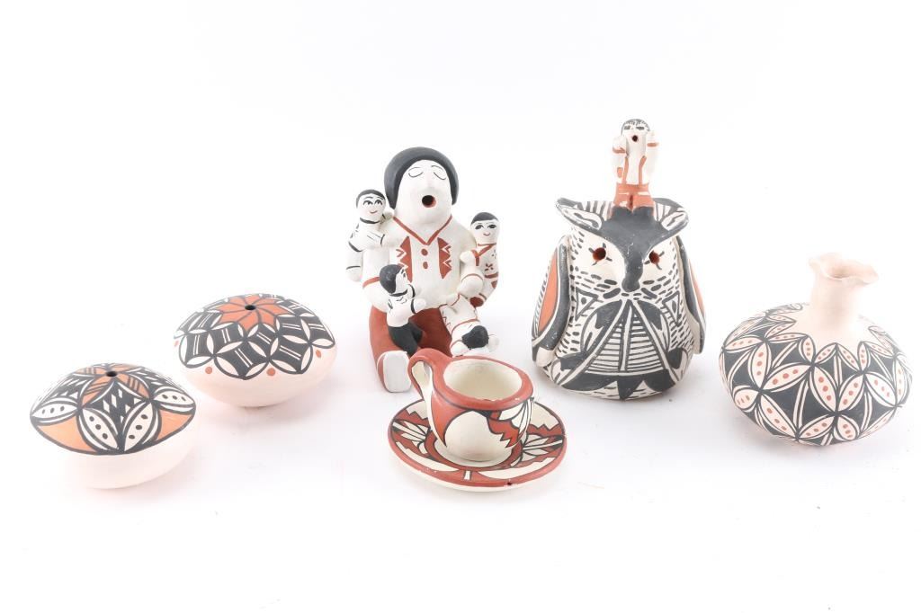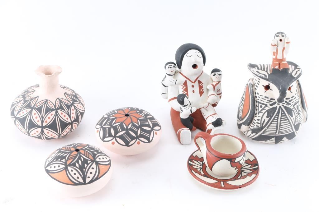 (2) Storyteller pieces, one an owl with speaker on top measuring 6 1/2" by 3 1/2"; the other a large speaker sitting with children all over, measuring 4 1/2" x 5". Both signed on bottom. (2) Hollow discs, beautifully painted, measuring approx 4" around, signed on bottom. (1) Vase measuring 4" tall by 4" around, signed on bottom. (1) Small teacup and saucer, measuring 2 1/2" tall by 4" around.