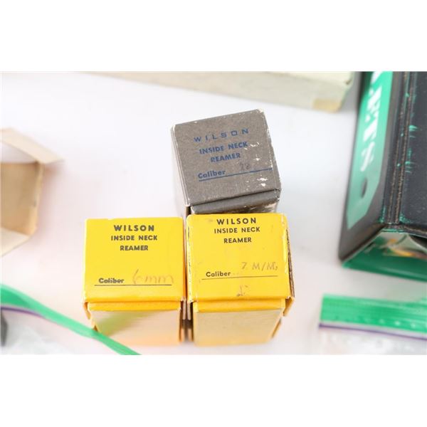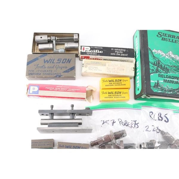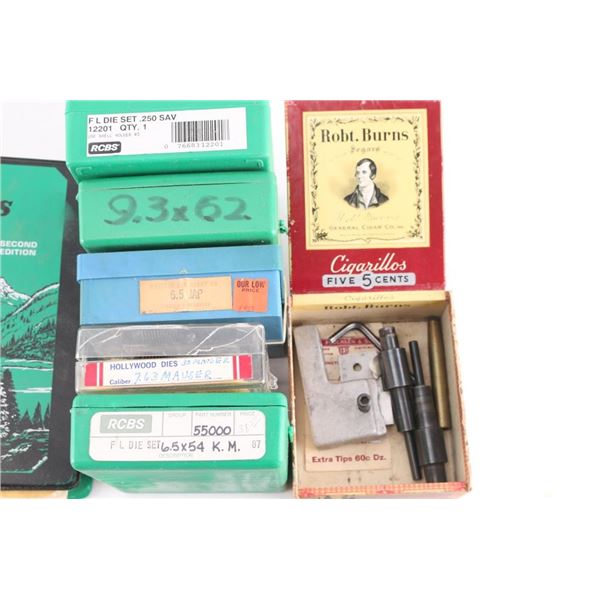 Includes 4 - RCBS reloading dies for 9.3 X 62, 6.5 X 54, .250 Savage & .220, 2 - Hollywood 7.63 Mauser & .257 Roberts; 1 - Pacific Gunsight Co. 6.5 Japanese; Wilson case trimmer and reamers; Forster Bros. bullet puller for 6 calibers; Pacific Gun Sight Co. shell holders and more.