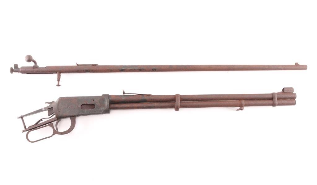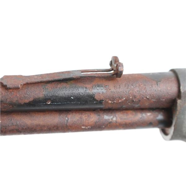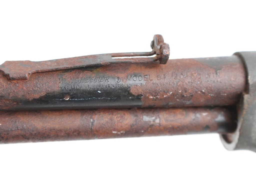 A) Winchester Model 94 .30-30 SN: 3451985. Relic Condition. Manufactured 1970. Ground dug, no wood. no markings visible except the serial number on th underside of receiver, 20" barrel with hooded front sight. sporting rear sight, missing elevator. Rusted, hammer and lever frozen in place. Appears to be a 30-30.B) Winchester 67A .22 S/L/LR NVSN. Barreled action, no wood. Relic condition. Ground dug, rusted, bolt is frozen in place. 27" barrel with blade/bead front, rear sporting sight. (Missing elevator)
