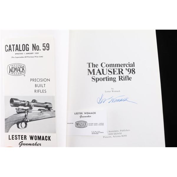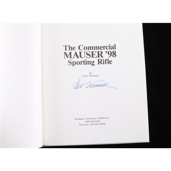 Full title, "The Commercial Mauser 98 Sporting Rifle". Hardcover – January 1, 1980 by Lester Womack. Published in Prescott, AZ, 69 pages, many B&W photos. Signed copy. Lester Womack was a professional gun maker from Tucson who built precision Mauser sporting rifles. Like new condition.