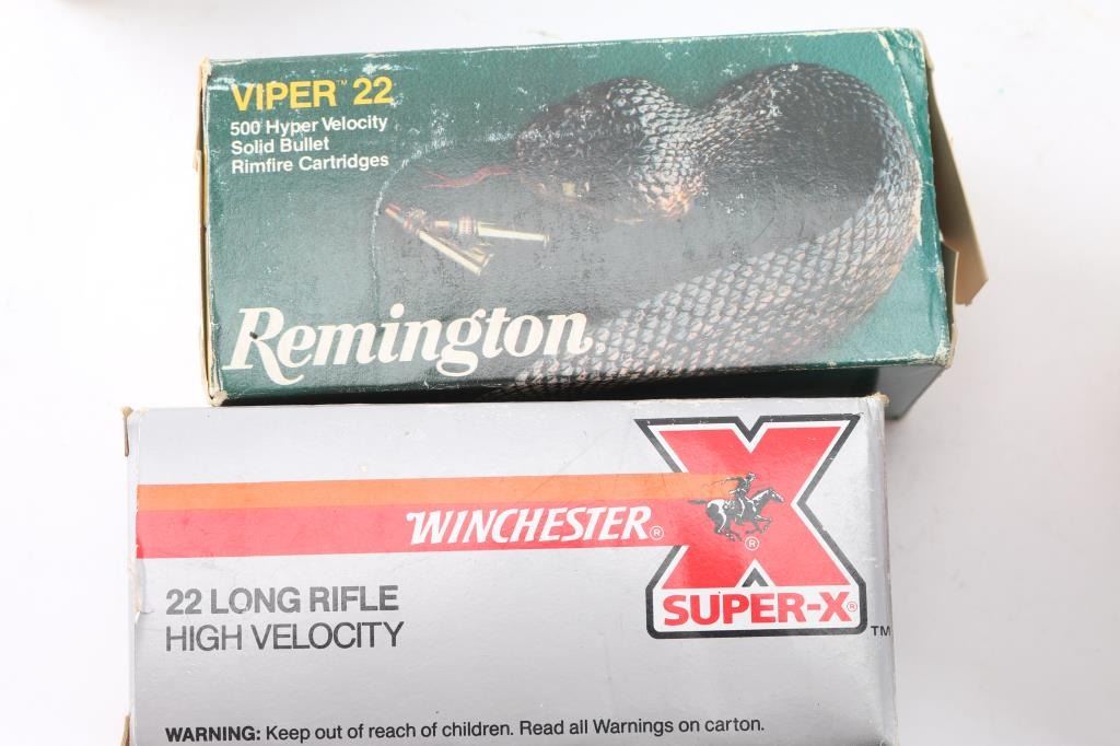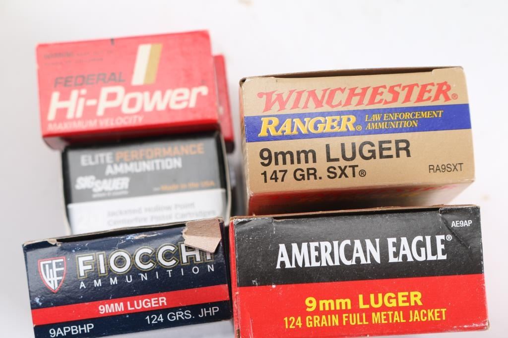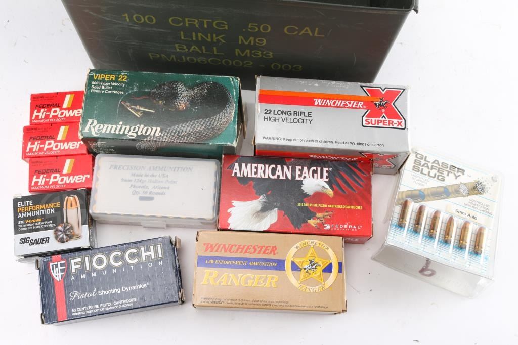Approx. 1340 rounds total. Approx. 240 rds of 9mm factory new ammunition from Sig Sauer JHP, Winchester 147 Gr. SXT, Fiocchi 124 Gr. JHP; approx. 500 rds of Remington Viper 22, 36 Gr. solid bullet; approx. 350 rds of Federal 22LR & approx. 300 rds of Winchester 22LR, 40 Gr. lead bullet. All in factory boxes.