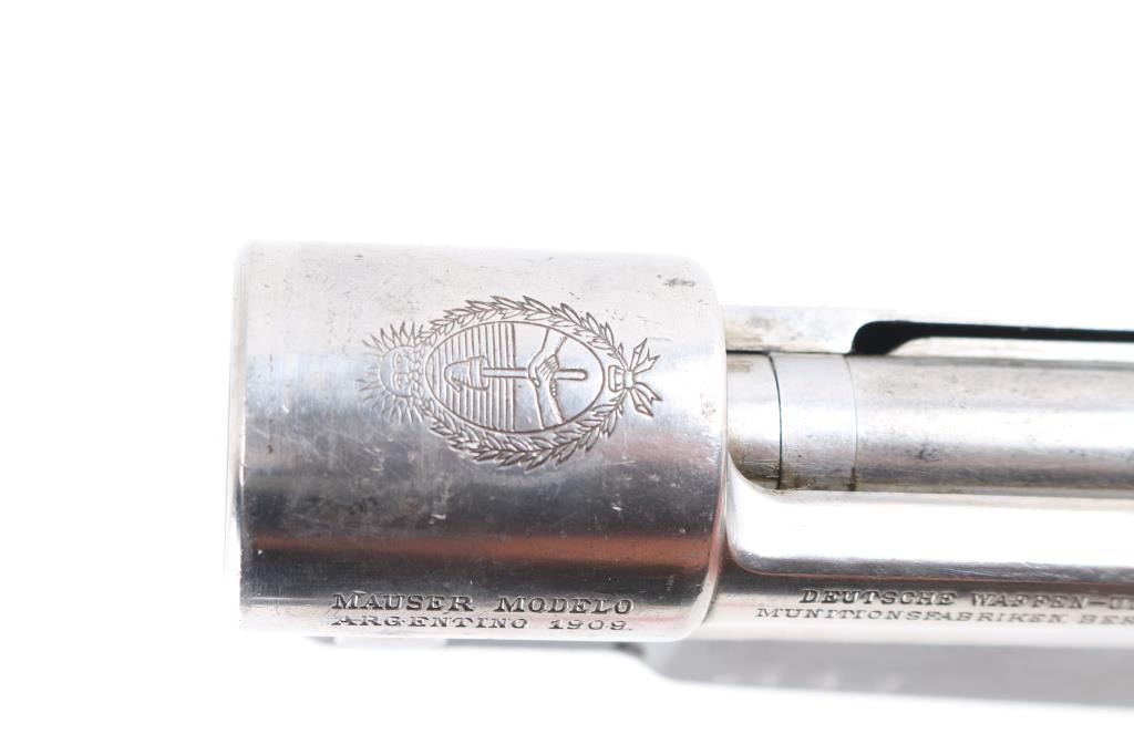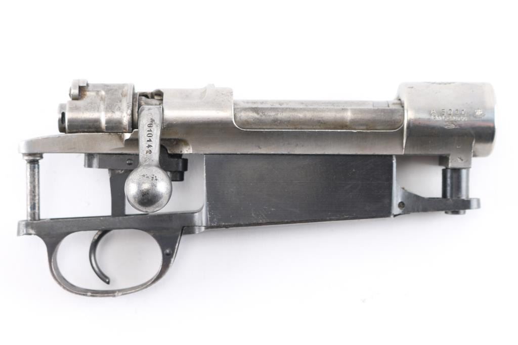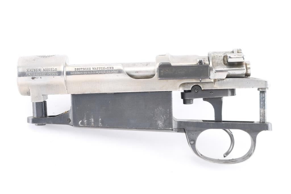 German made action for the Argentine model 1909 Mauser. Complete with bolt, trigger, bottom metal with hinged floor plate. Mismatched serial numbers. Bent bolt handle. Bolt action works well. Polished stainless finish.NRA Condition-Very Good. (Action Only) Modern Firearm.