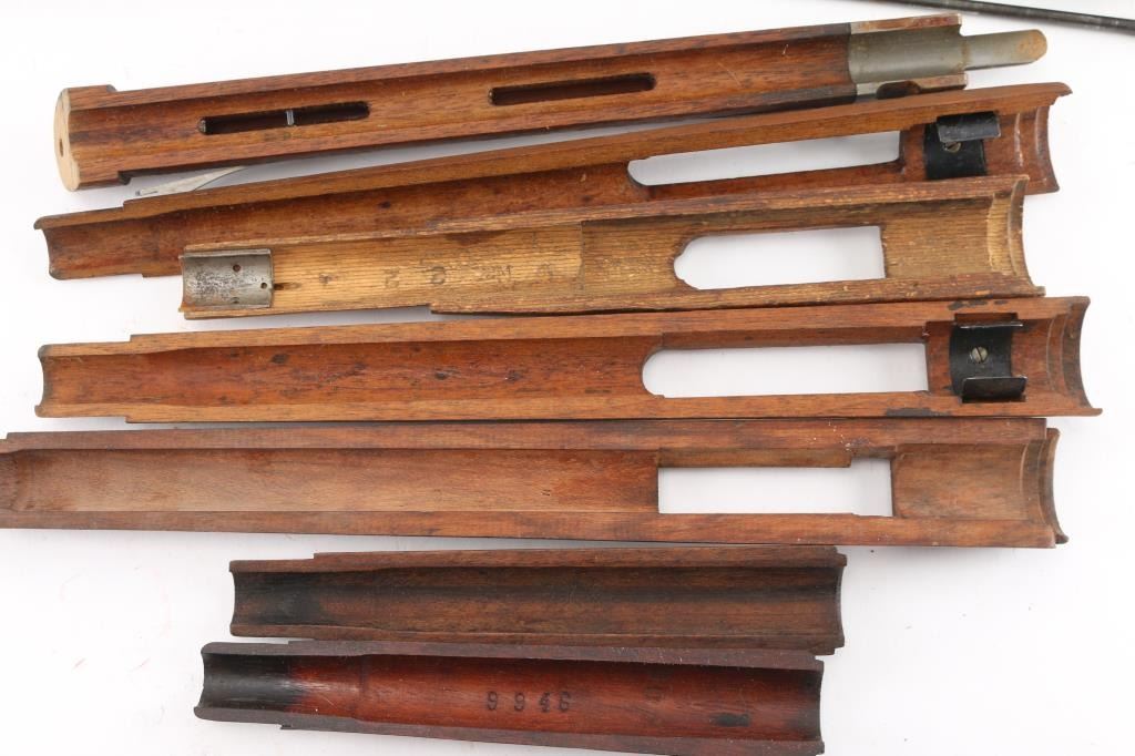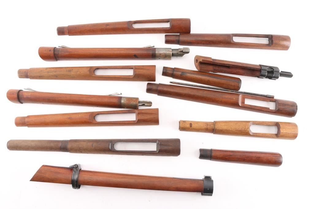 Nine total handguards and four cut forends. 1 - 11", 1 - 12 1/2", 3 - 13 3/8" stamped "RA" Republic of Argentina, 1 - 14 1/4" stamped three intersecting circles, 1 - 15 5/8", 2 - 7 1/2"; Four "Duffel Bag" cut forends. 1 - Chilean Mauser 1895 w/stamped cross hammers on both bands; 1 - K98; 2 - Mausers. Most wood handguards are in good condition with some rust and pitting on metal parts.