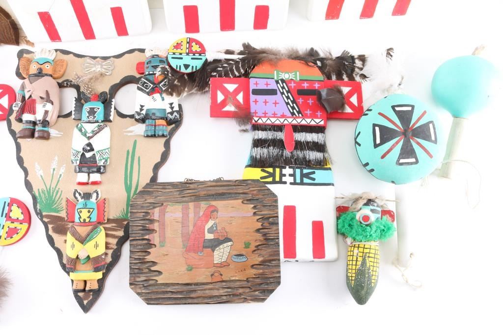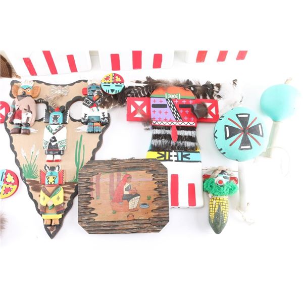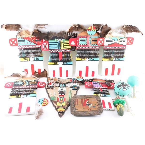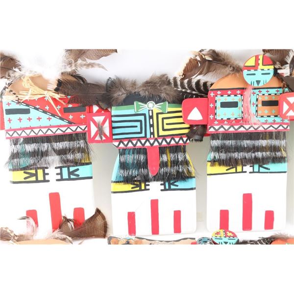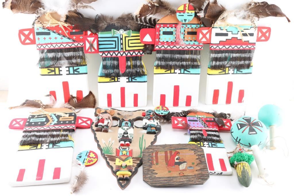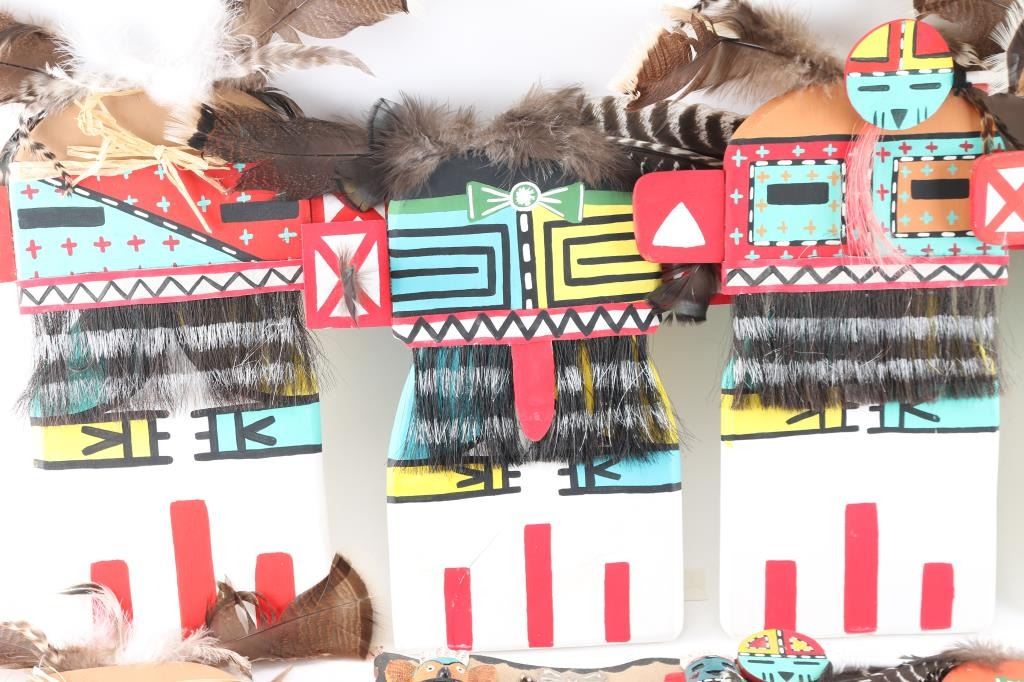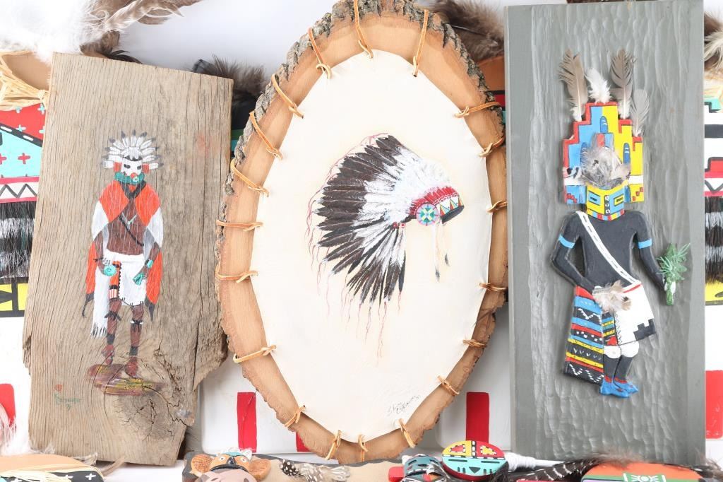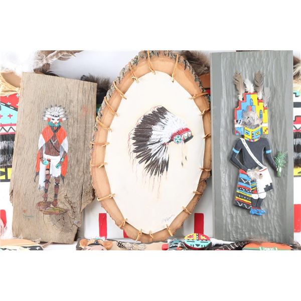 (6) Flat Hopi Kachinas by Vincent Seckletewa. (1) Painted Indian headdress painted on leather, signed. (3) Indian Wall hangings.