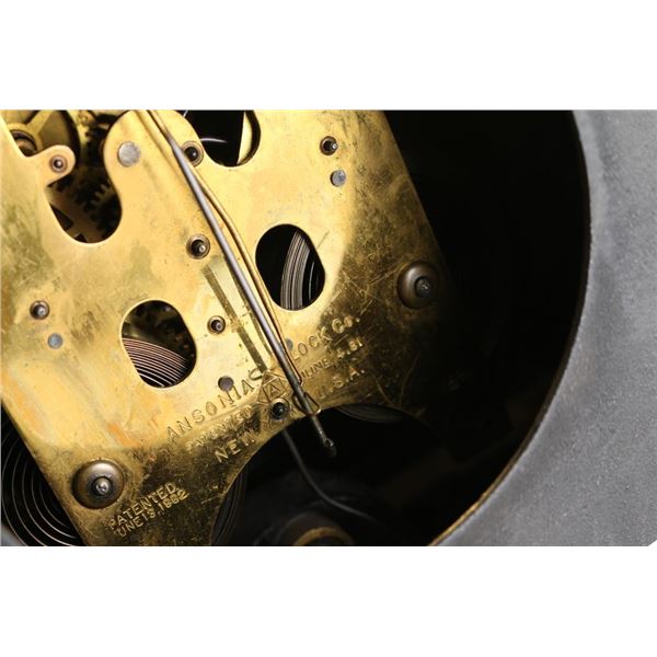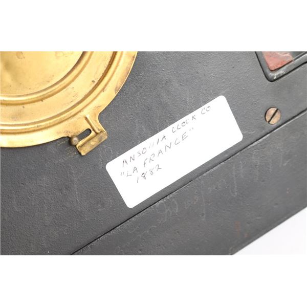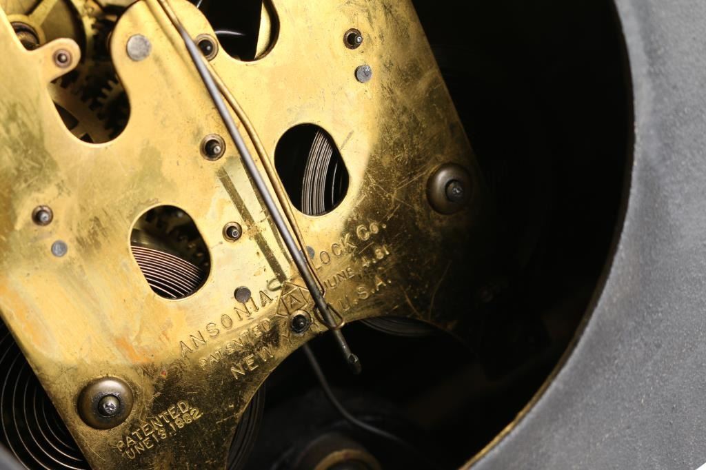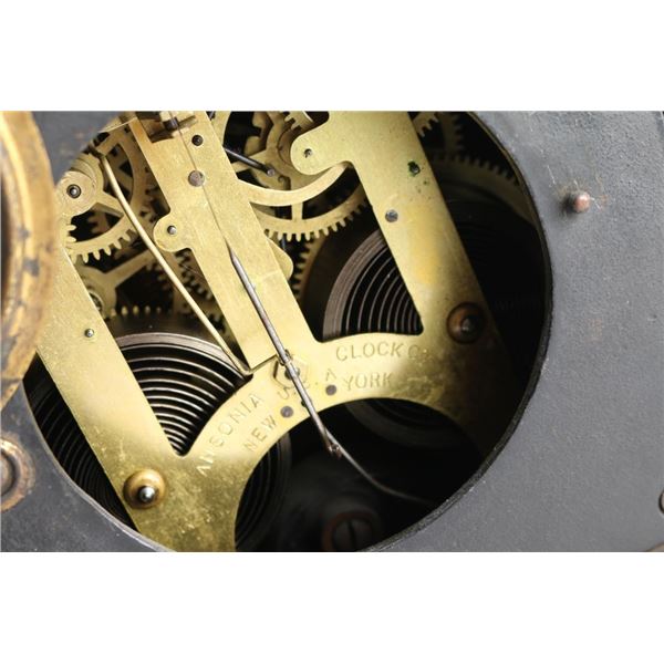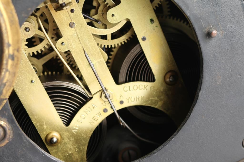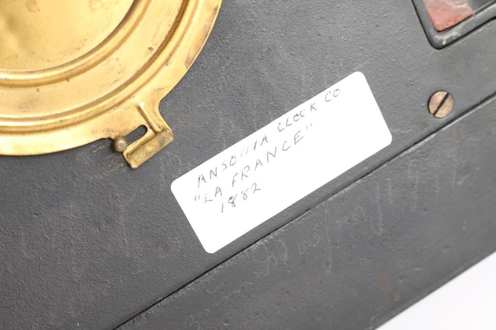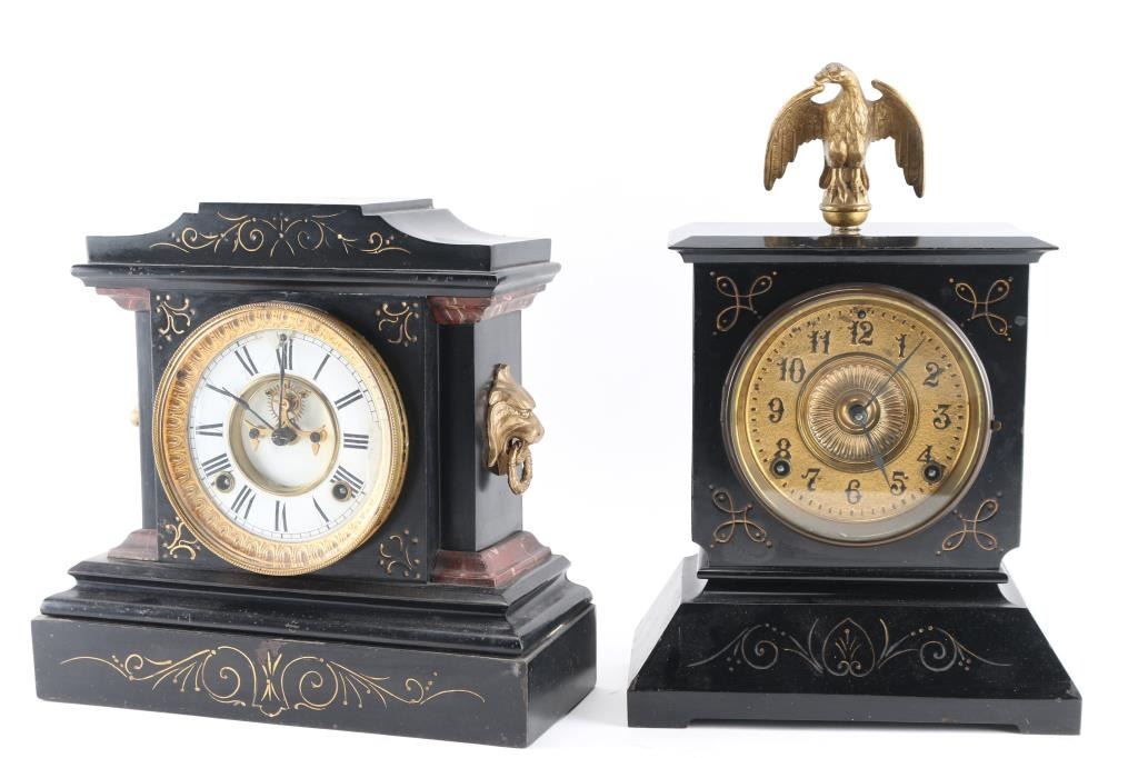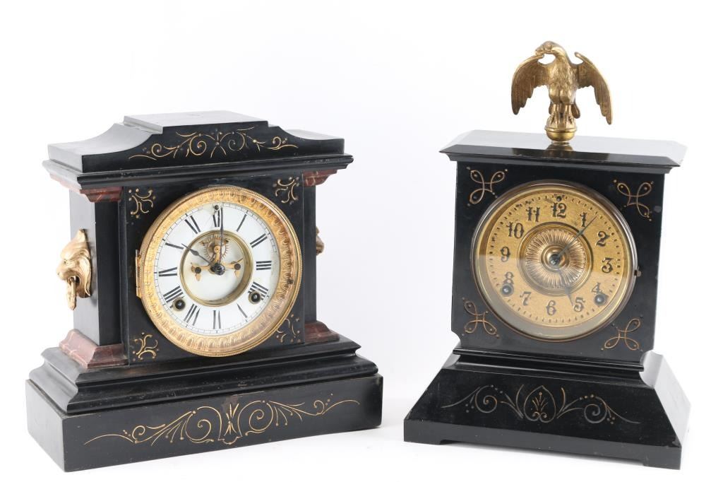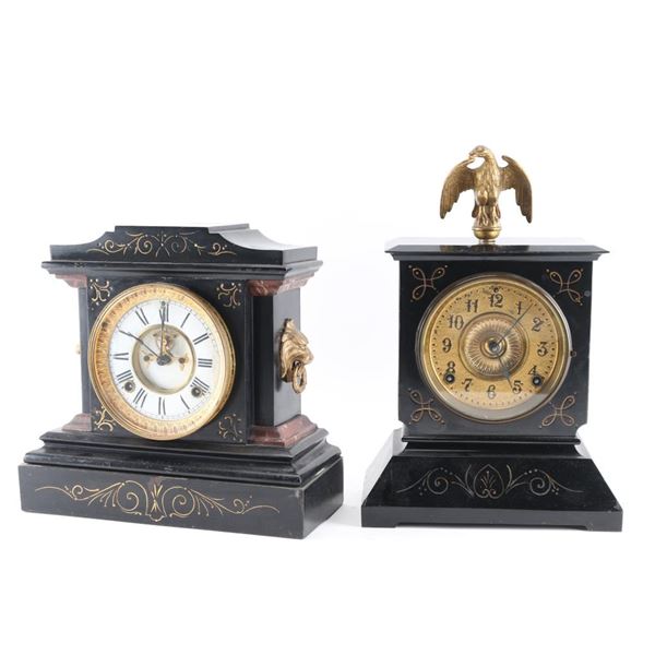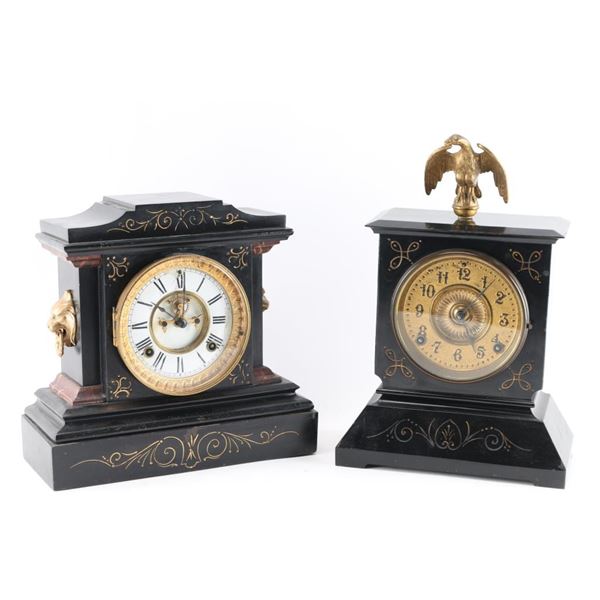 1- Ansonia cast iron mantel clock. "La France" 1882 w/ pendulum and key. 4" dial. 11"H x 11-1/2"W.2- Ansonia cast iron mantel clock. 4-1/2" dial. 14"H x 9-1/2" W.
