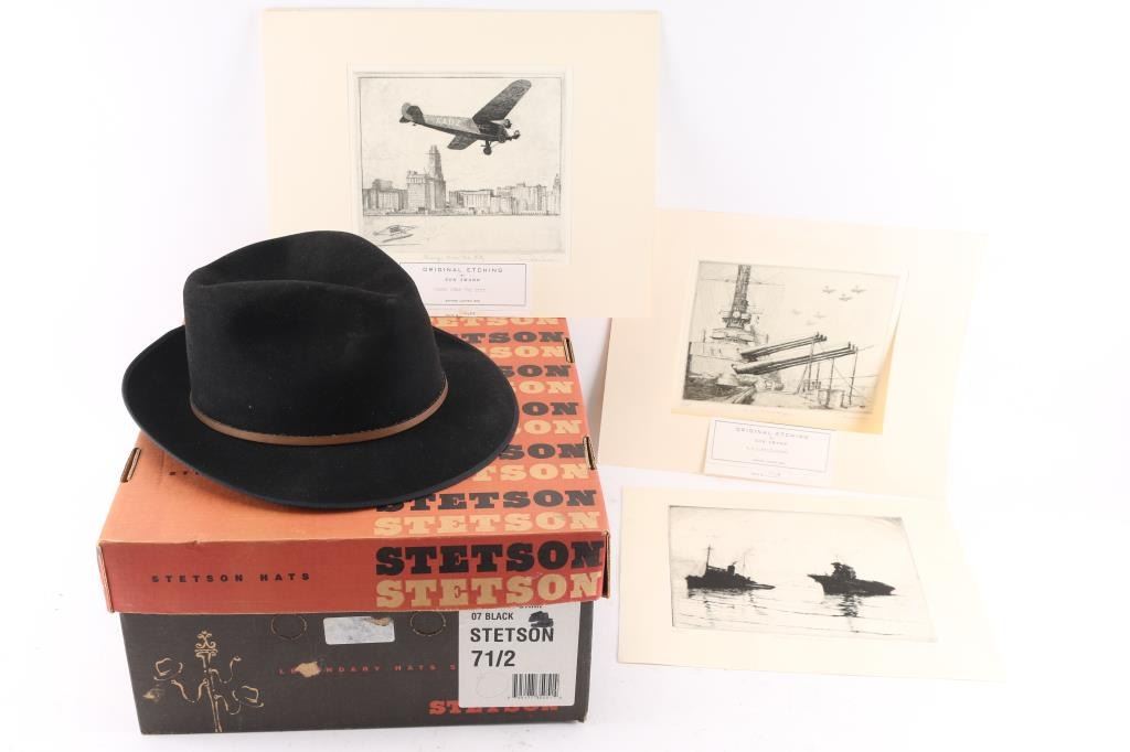 Includes: Stetson Roadmaster hat w/ 2-1/2" brim. Size 7-1/2". (5) Don Swan prints from WWI. (Days Work Done, USS Mississippi, Wings Over The City, Big Guns Speak, and Navy Scout).