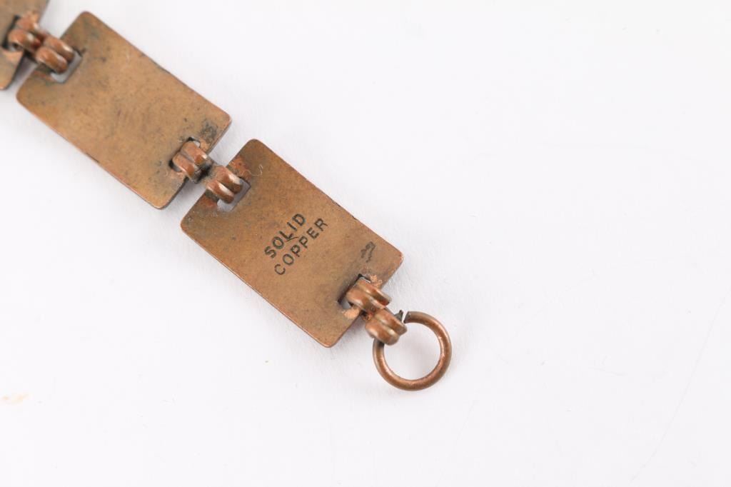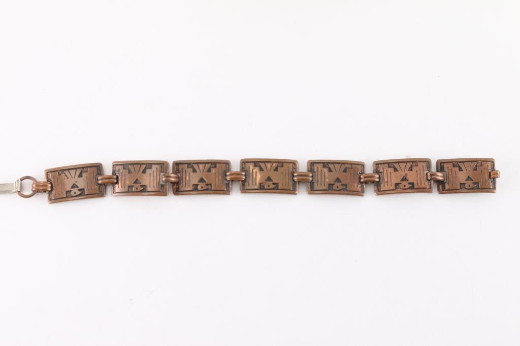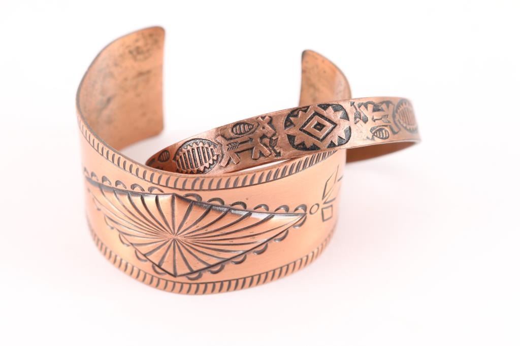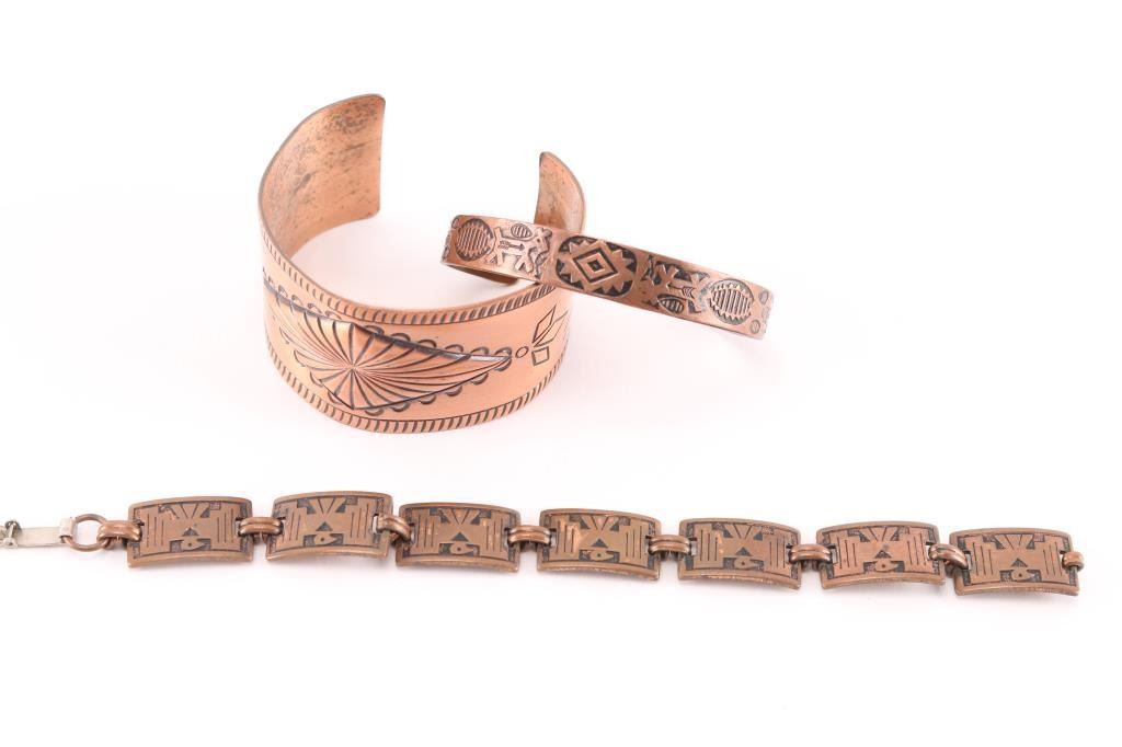 (2) Copper cuffs with native American designs, one 1 1/4" wide and one 1/4" wide, both measure 6 1/2" with gap. (1) Copper link bracelet with Thunderbirds on each link. Measures 7".
