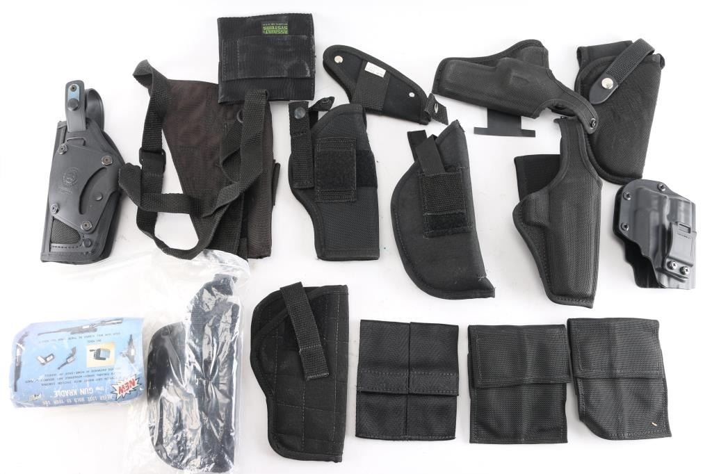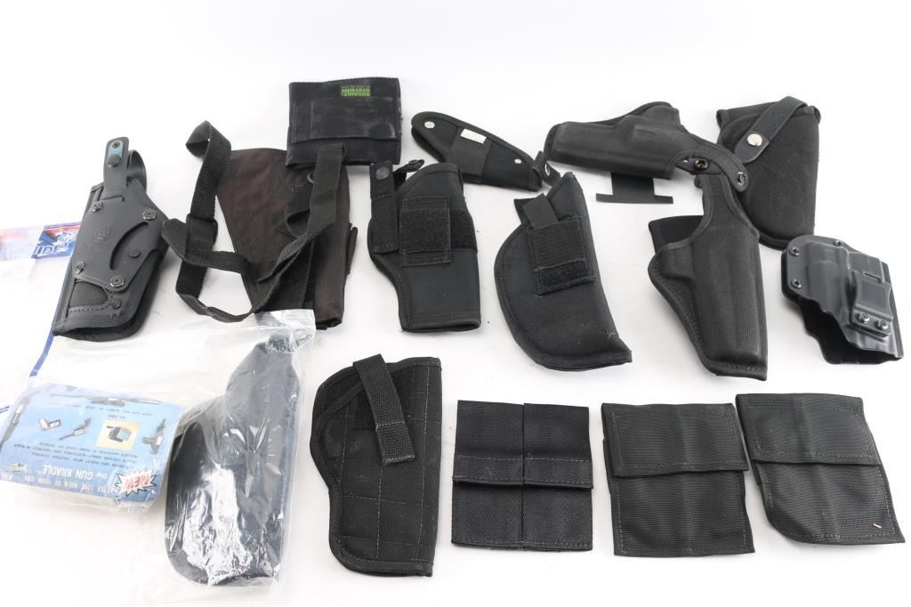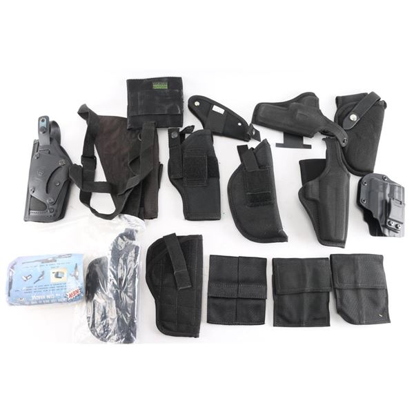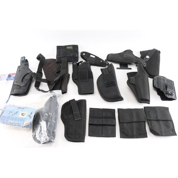 Approx. 15 total. 11 holsters and approx. 4 double pouches. Most are right hand carry/draw, different makes, models and sizes. All in very good condition.
