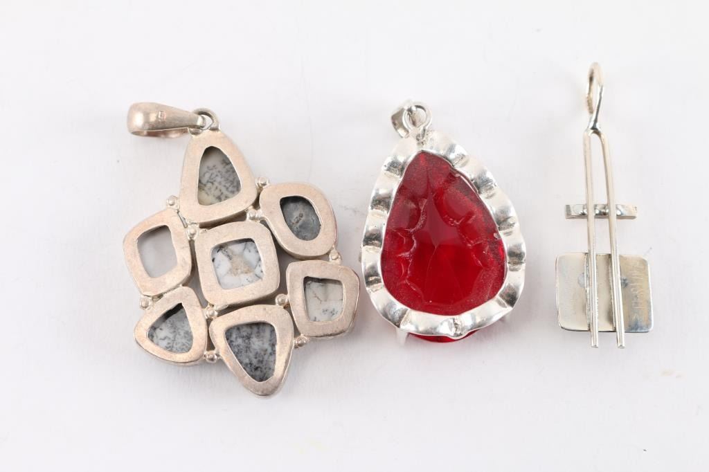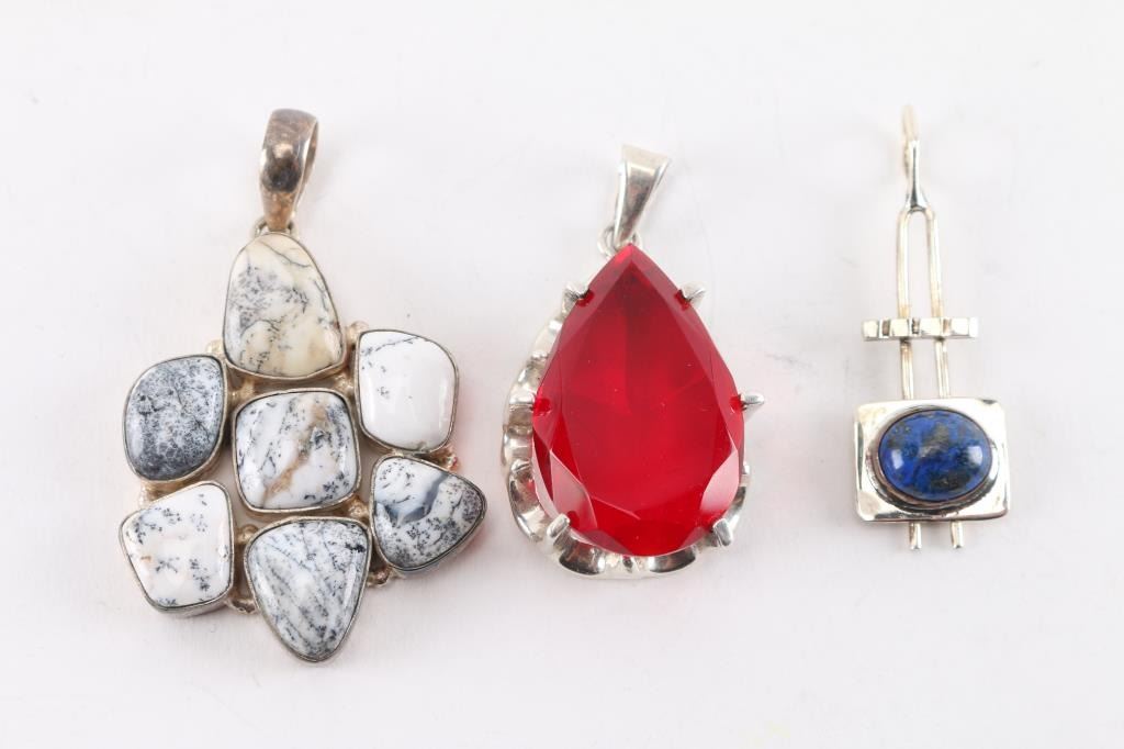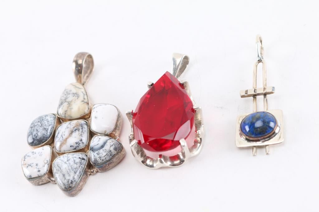 (1) Large red glass teardrop in set in sterling silver, measures 1 3/4" long. (1) 7 dendrite opal stones in a sterling flower shape pendant, measures 2 1/4" long. (1) Lapis pendant in sterling silver, measures 2" long.