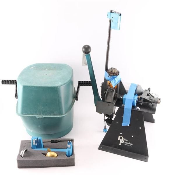 (1)Square Deal B model. The Square Deal B is Dillons most compact machine, it loads common straight-walled handgun and carbine cartridges from .32 S&W Long through .45 Colt. Comes with a black Dillon mount and powder dispenser, Dillon powder scale and Cabelas case tumbler. Powder dispensers has a broken shaft, still in top mount. All in fair to good condition.