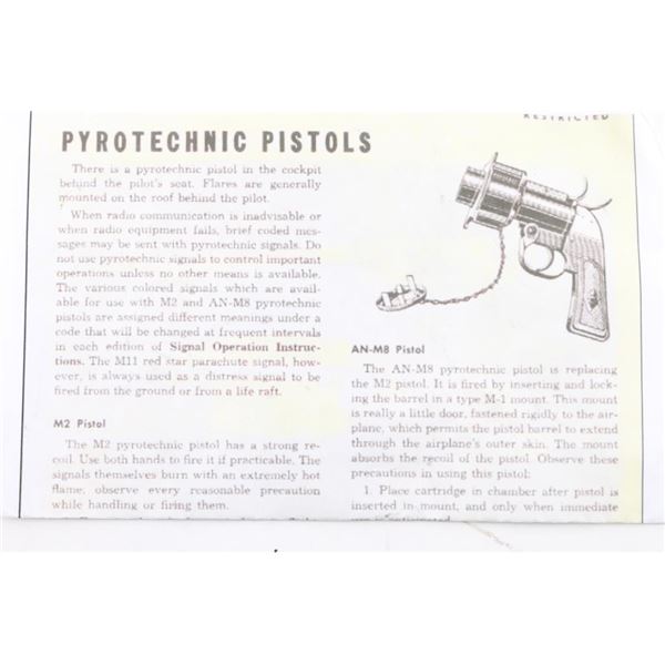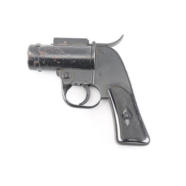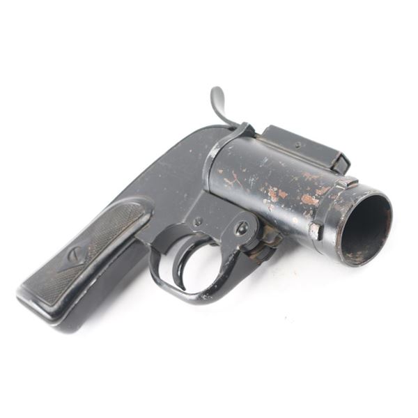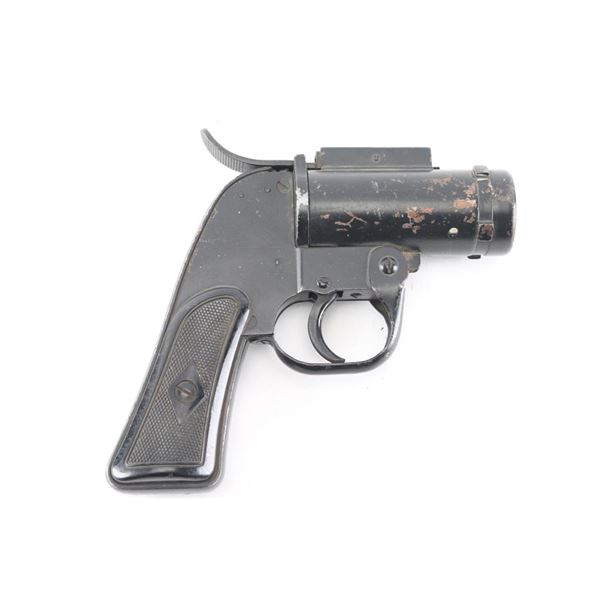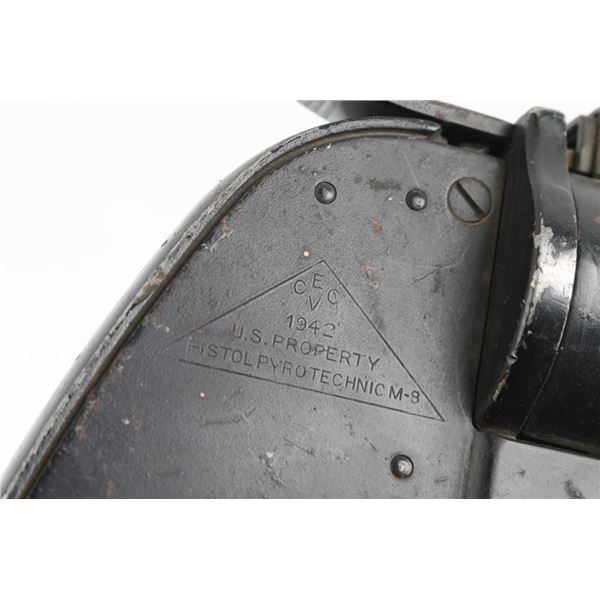 S/N#001309 WWII and later era U.S. military double-action-only top-break 40mm flare pistol developed primarily for aircraft use. Features a 4 1/8" barrel, steel frame with aluminum grip straps, smooth trigger w/ guard, concealed hammer, checkered black synthetic grips. One latch on top to open the action. The right side of the frame is marked "CECV / 1942 / U.S. PROPERTY / PISTOL PYROTECHNIC M-8" in a large triangle and the butt is stamped "P" with crossed cannons mark. Bore is in fair condition with some rust spots inside the front and most areas outside of the barrel. Steel parts are black color paint finish with some scratches and edge wear. Grips are in good condition. Fair to good condition.