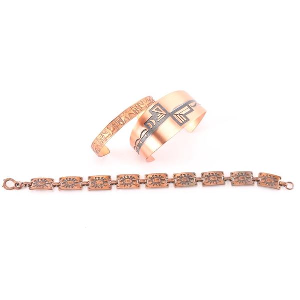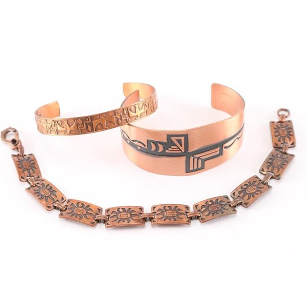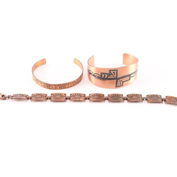 (2) Copper cuffs with native American designs, one 1 1/4" wide and one 1/4" wide, both measure 7 3/4" with gap. (1) Copper link bracelet with smiling suns on each link. Measures 9".