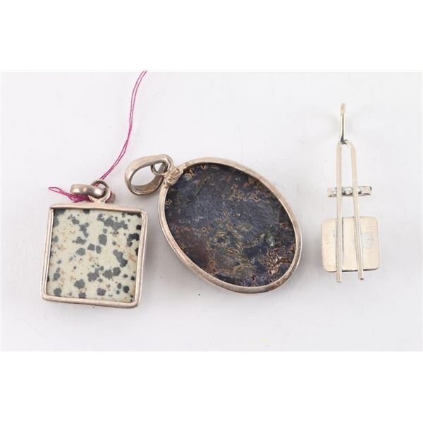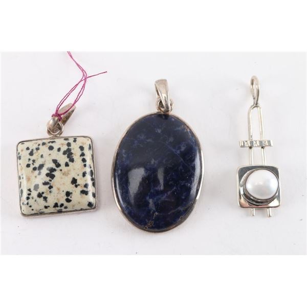 (1) Large oval blue sodalite stone in sterling silver. Measures 2". (1) Square dalmation jasper from North Carolina set in sterling silver, measures 1 1/2". (1) Charles Skiera ocean pearl pendant set in sterling silver, maker marked, measures 1 3/4".