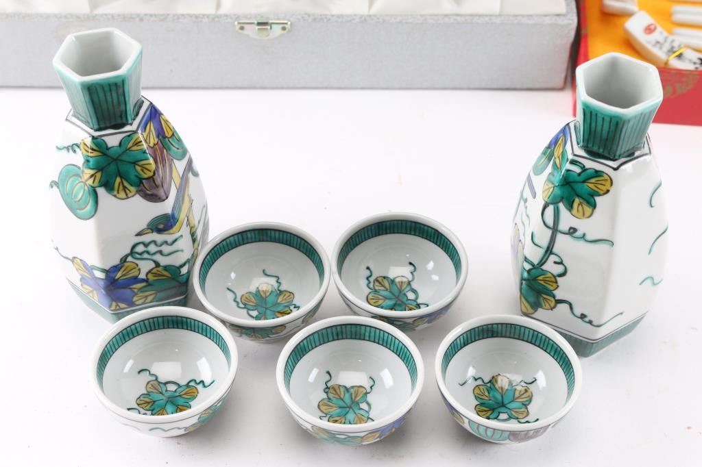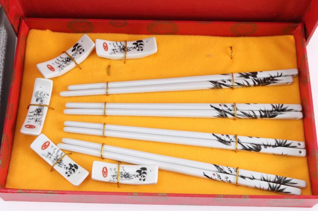 Porcelain saki set with two pourers and five cups. Green, grey, blue, yellow design. Comes in satin covered wood box. Porcelain chopstick and rice utensil set has panda bear design. 4 pair chopsticks and 5 rice spoons.