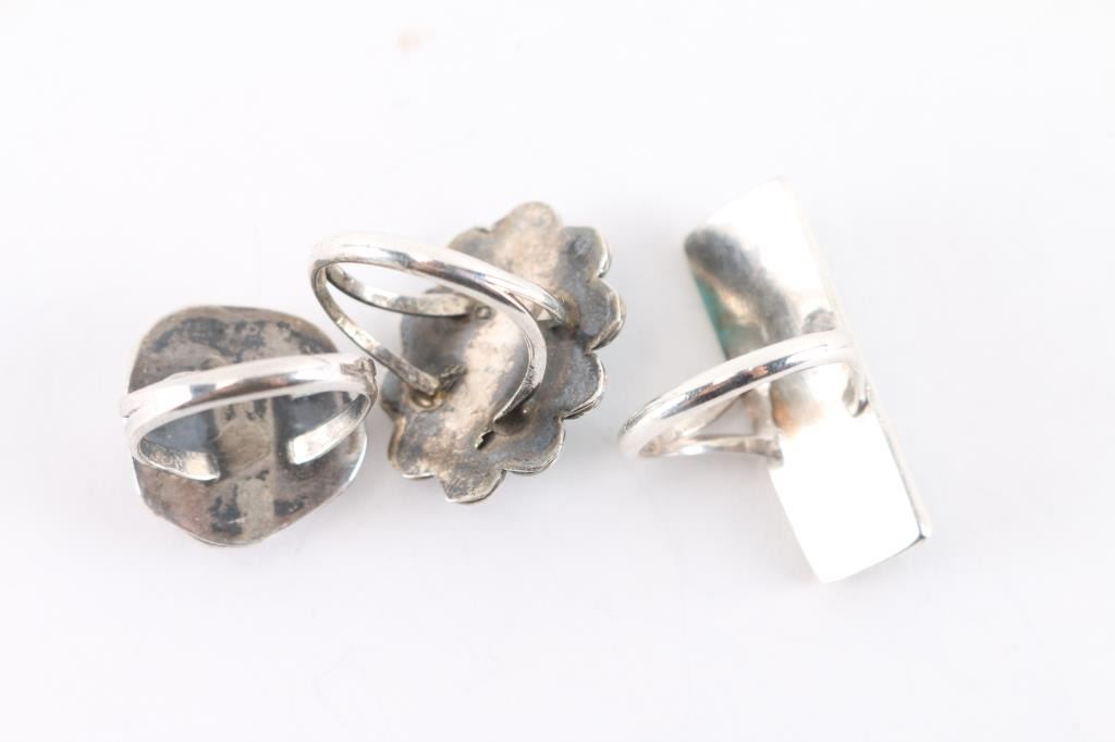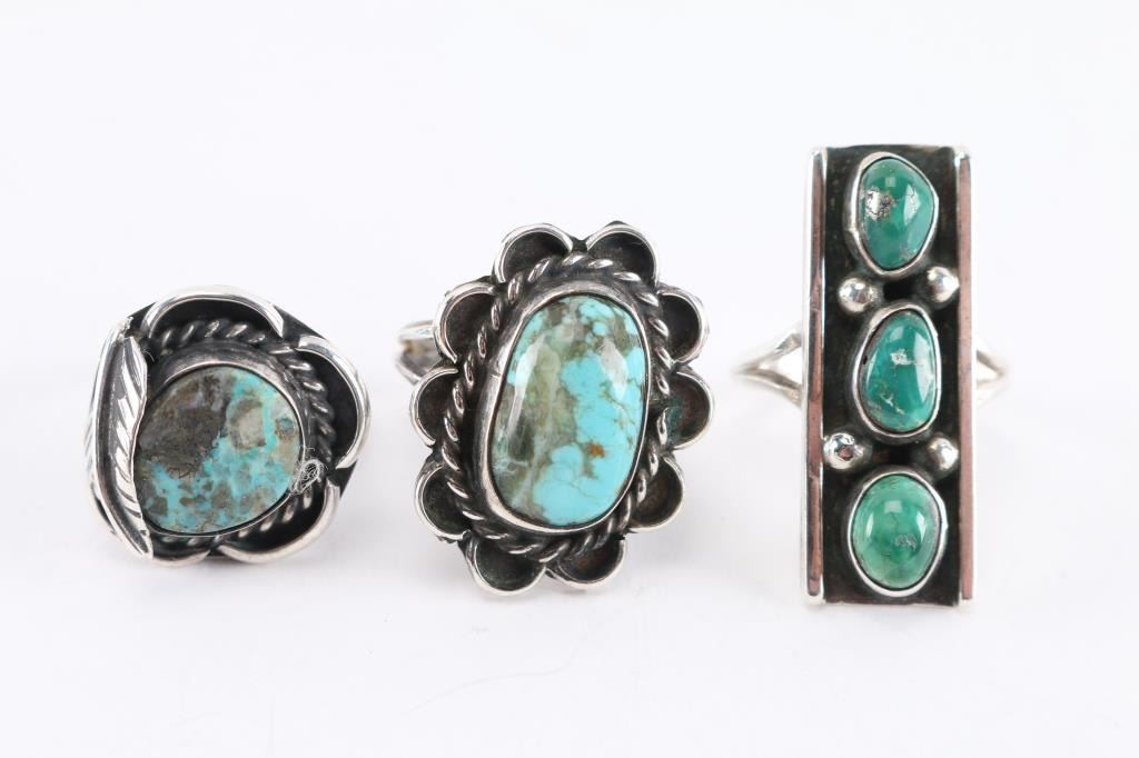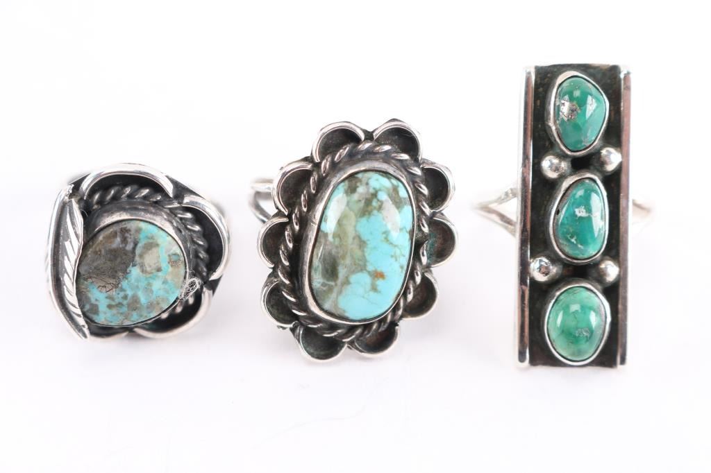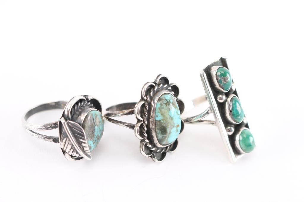 (1) Rectangle with 3 green turquoise stones, size 6 3/4. (1) Oval turquoise stone in sterling silver, size 6 3/4. (1) Turquoise stone in sterling with feather design, size 6 3/4.