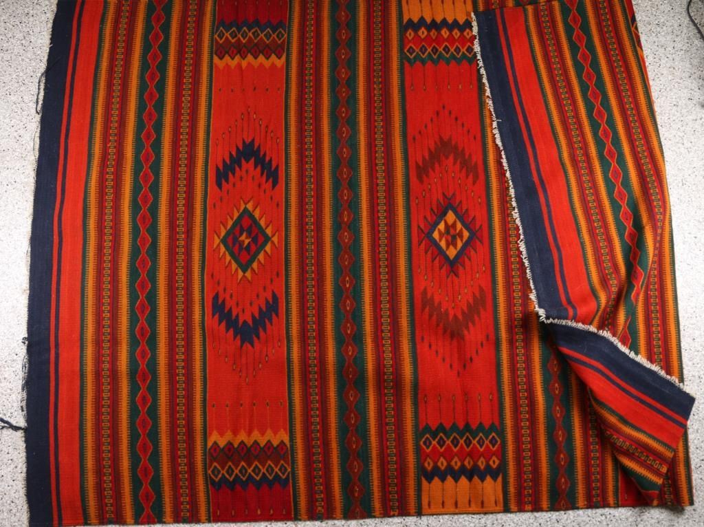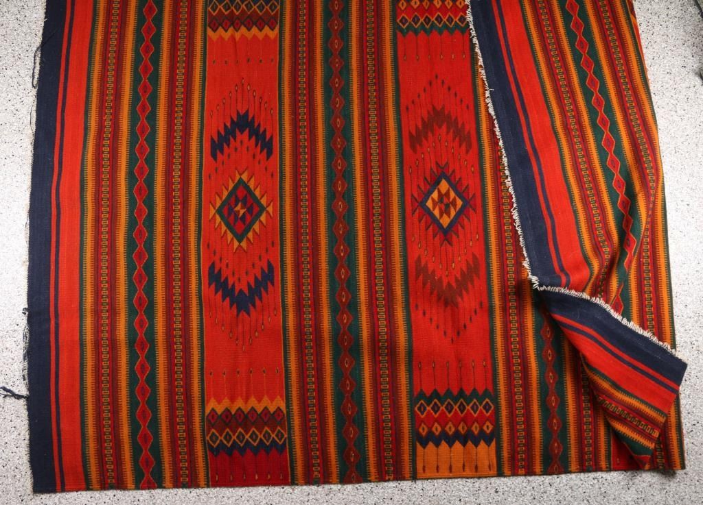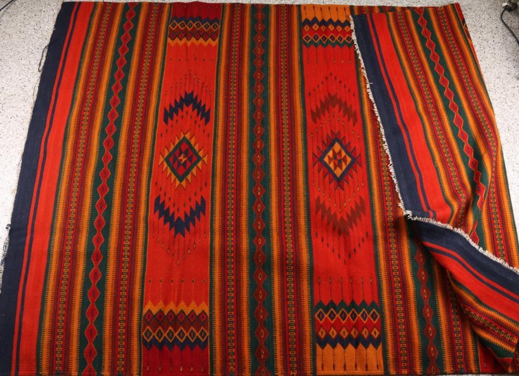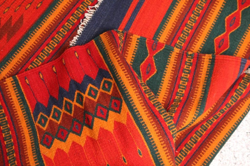 Hand-woven, 100% wool, made in Oaxaco, Mexico, measures 8 x 5. Bright colors of indigo, orange and red. Unraveling at one end, otherwise good condition.