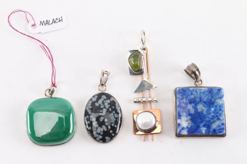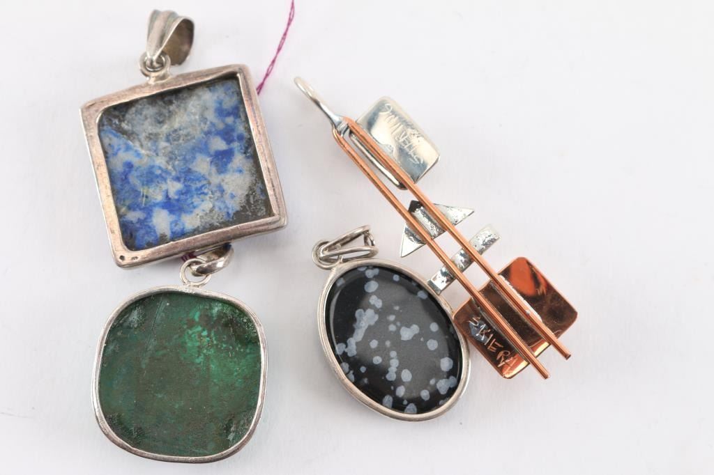 (1) Charles Skiera copper and sterling pendant featuring Arizona peridot and ocean pearl, maker marked, measures 2 1/2". (1) Square lapis stone set in sterling silver, measures 1 1/2". (1) Rounded square malachite stone in sterling measures 1 1/4". (1) Oval snowflake obsidian stone in sterling, measures 1 1/4".