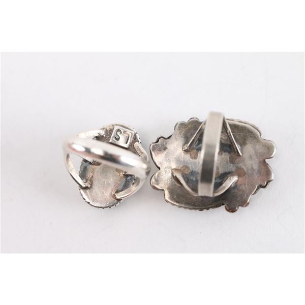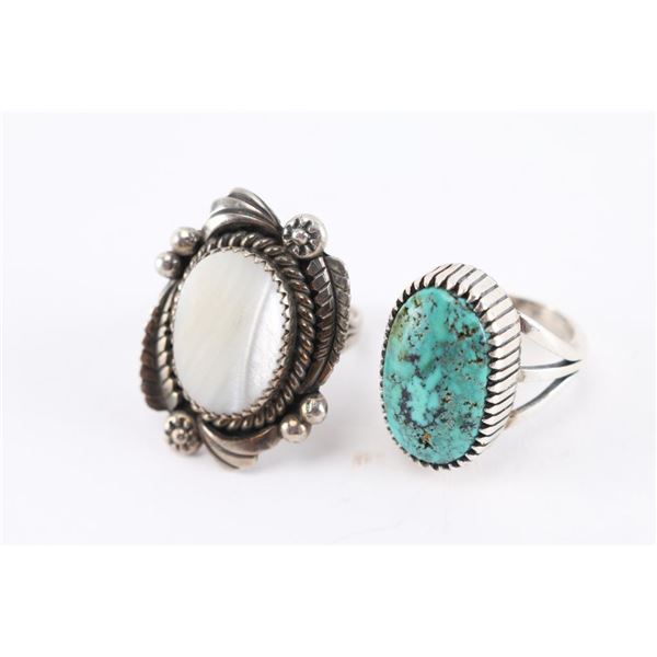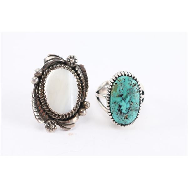(1) Oval turquoise stone set in sterling silver, maker marked, size 7. (1) Oval natural white stone in sterling silver, size 7.