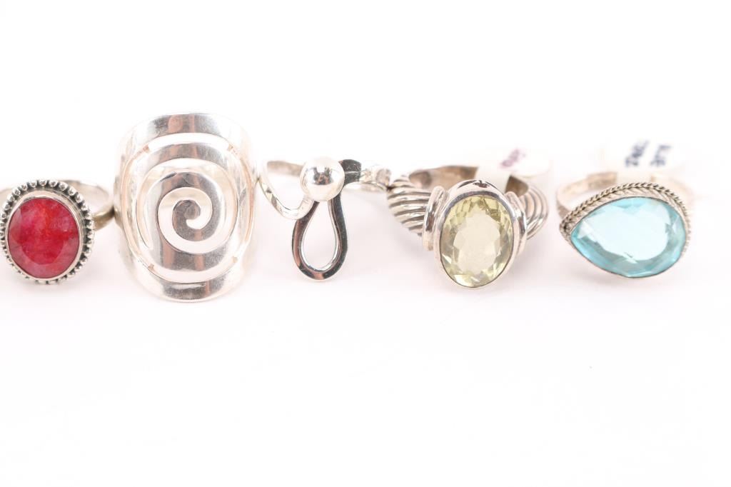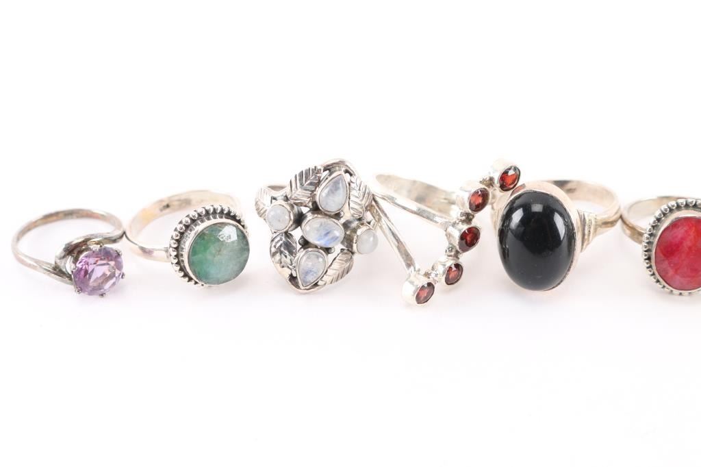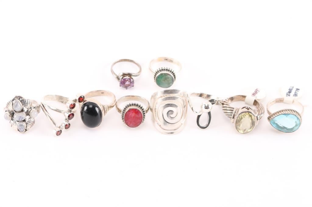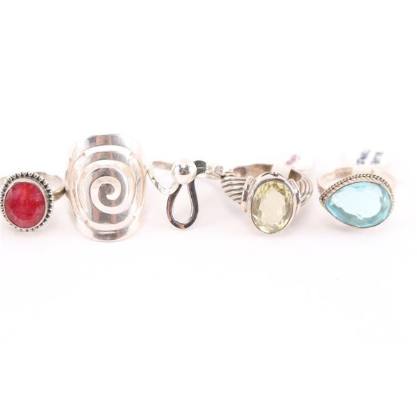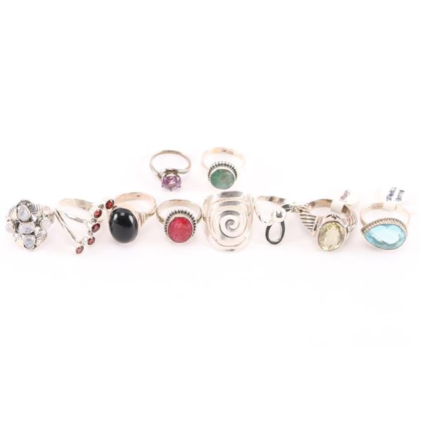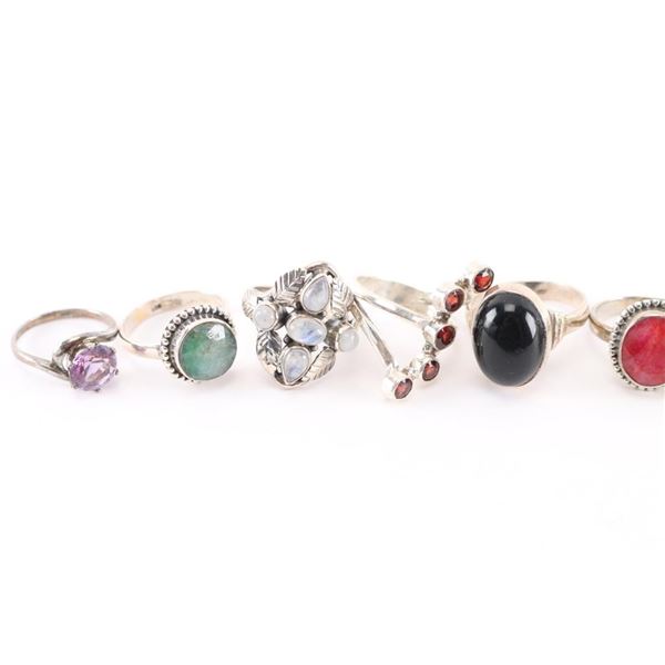 Includes onyx, blue topaz, amethyst. Most are sterling silver. Various sizes.