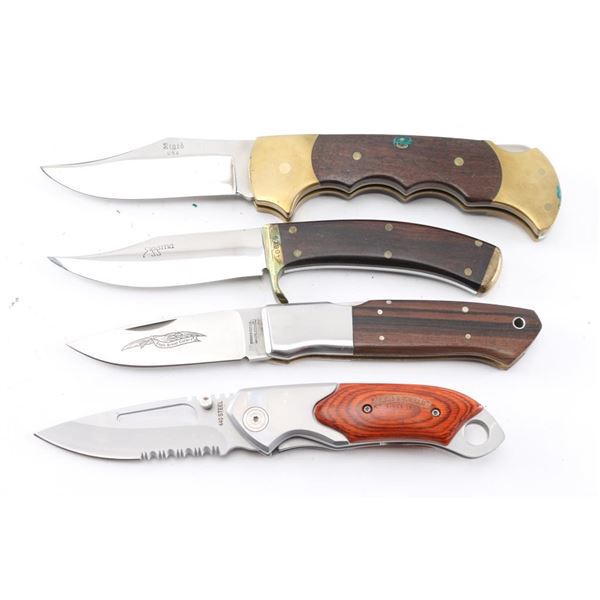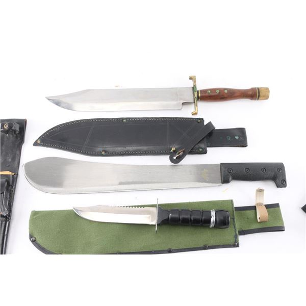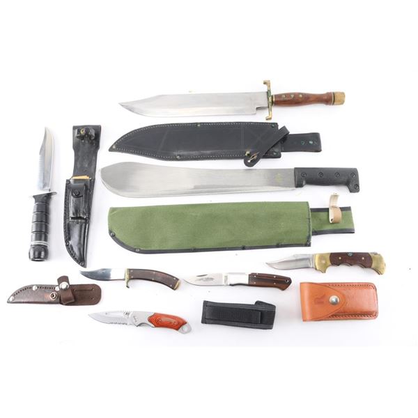 Seven total. Includes 1 - Siggma 3 1/2" fixed blade w/brown leather sheath; 1 - Eagle Brand Cutlery folder, 3" blade w/nylon sheath; 1 - Rigid folder, 3 1/2" blade w. tan leather sheath; 1 - Field and Stream folder, 3" blade half serrated; 1 - after market survival knife w/6" partially sharpened clip point/ top serrated blade w/ compass in pommel, matches, finishing line & hook, saw wire and rings in handle & black leather sheath/sharpening stone; 1 - unmarked Bowie knife, possible Pakistan/India make w/12" partially sharpened blade, brass guard, pommel and black leather sheath and 1 - Machete made in Taiwan w/15" blade and green nylon sheath. All in good condition or better.