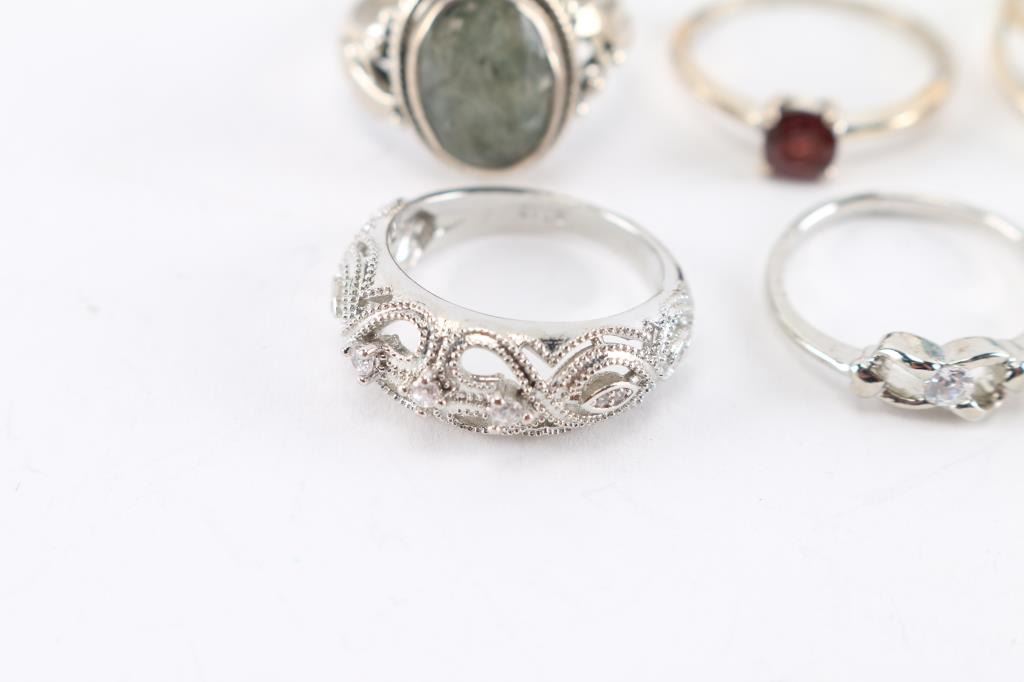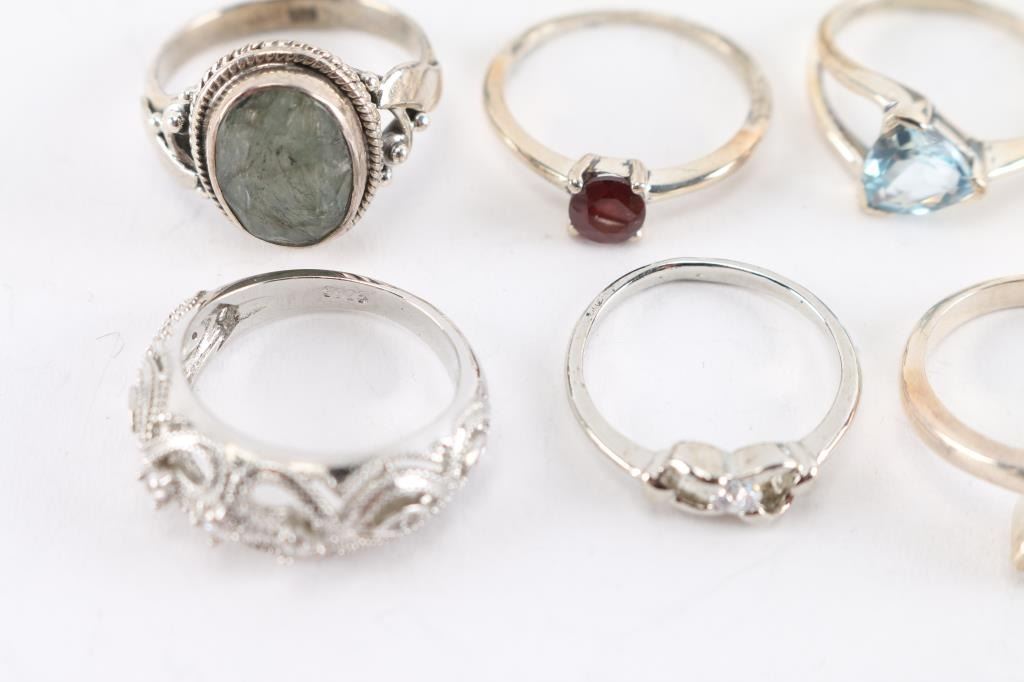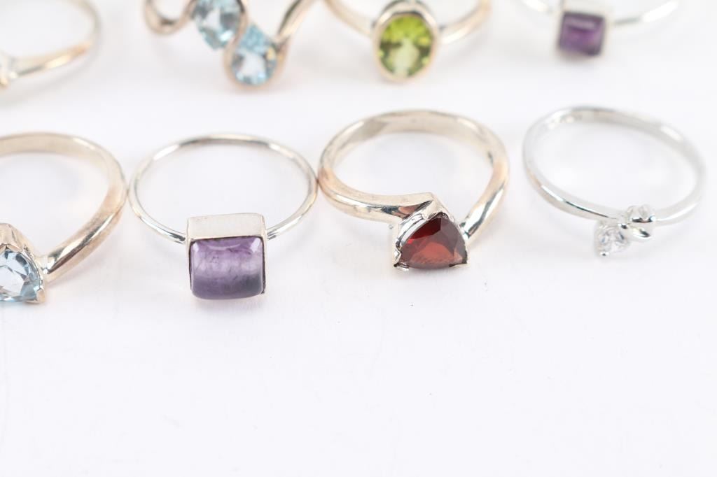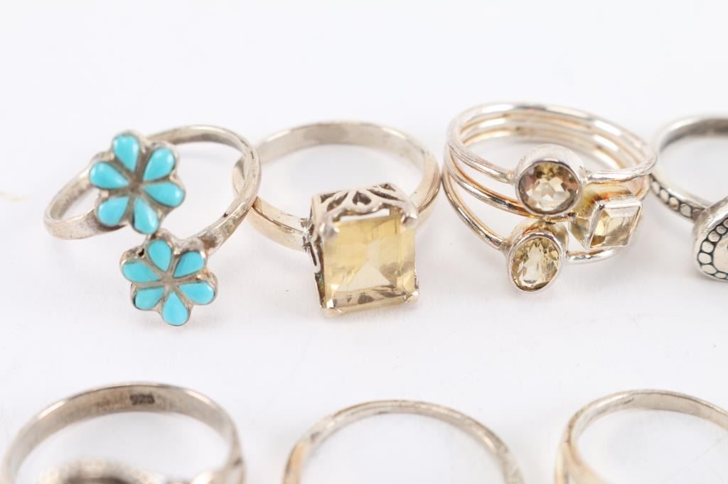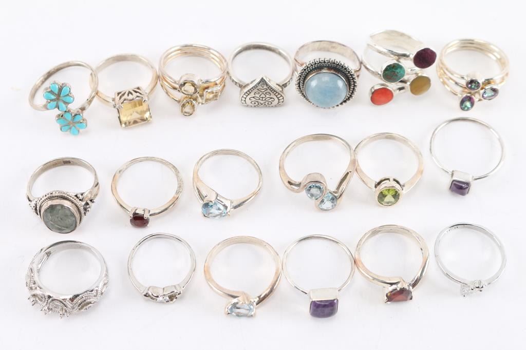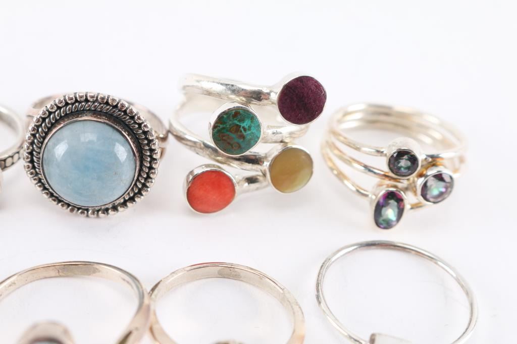 Approximately 18, mostly sterling silver, most have gemstone in setting. Various sizes.
