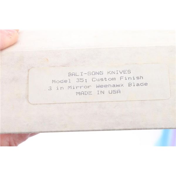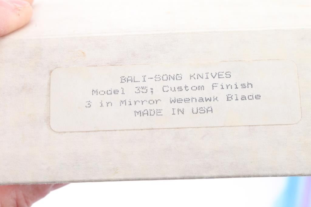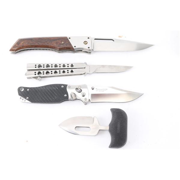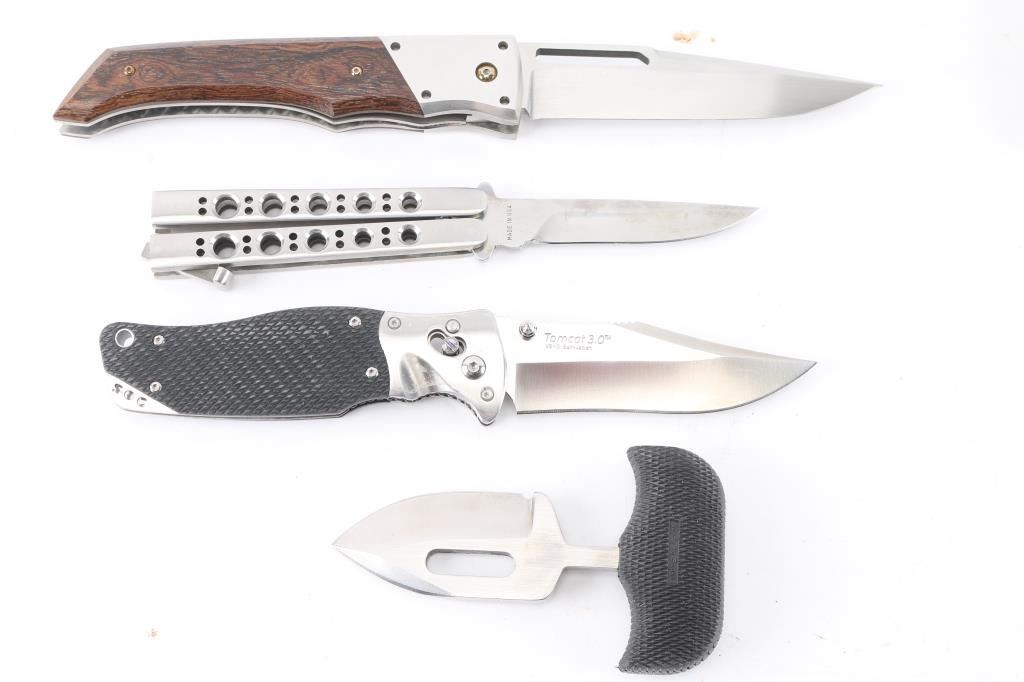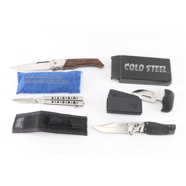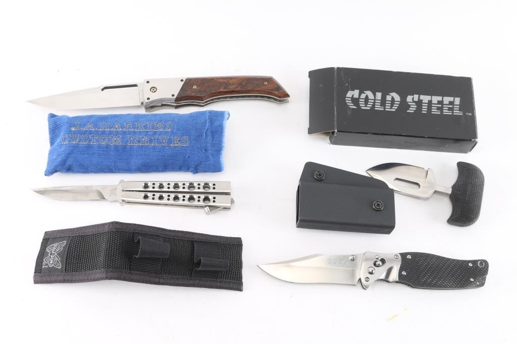 Four total. Includes 1 - J.A. Harkins custom folder w/liner lock, 4 1/2" clip point blade & signed on left side of blade, 6" steel handle w/ wood panels, comes w/blue corduroy bag & letter from maker; 1 - SOG Tomcat 3.0 folder w/kydex sheath; 1 - Cold Steel Urban Skinner w/ black leather tooled sheath & factory box; 1 - Benchmade Model 35/Balisong w/nylon sheath & factory box. All in pristine/unused condition.