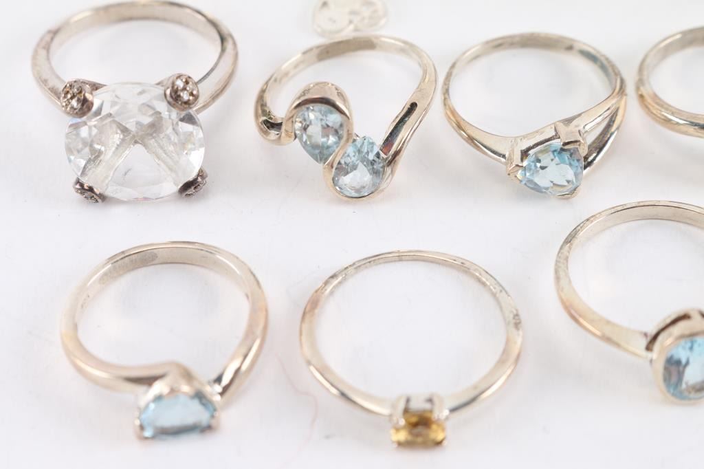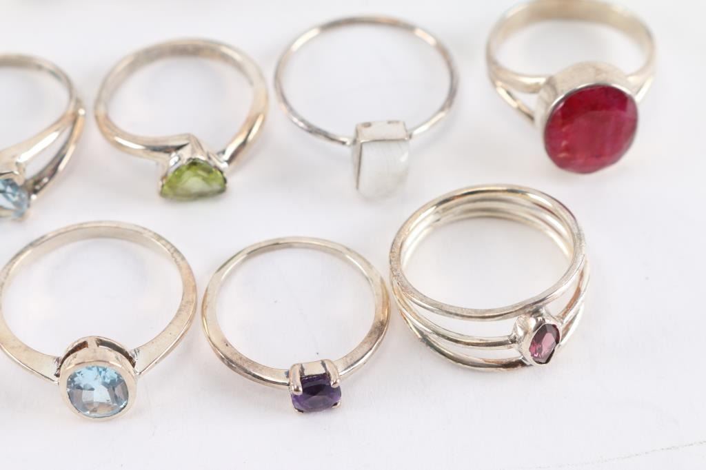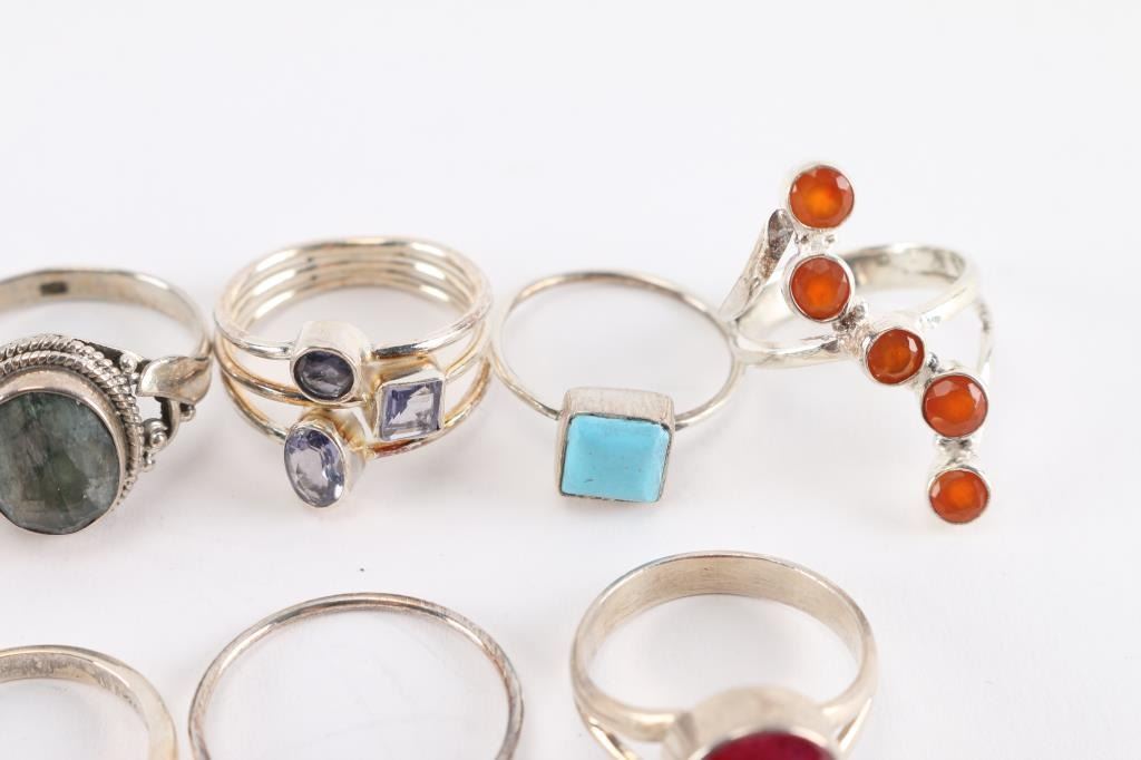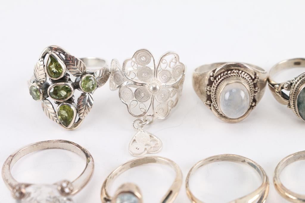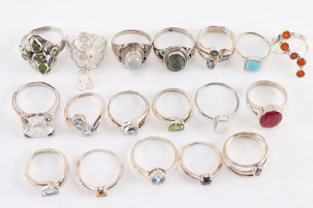 Approximately 18, mostly sterling silver, most have gemstone in setting. Various sizes.