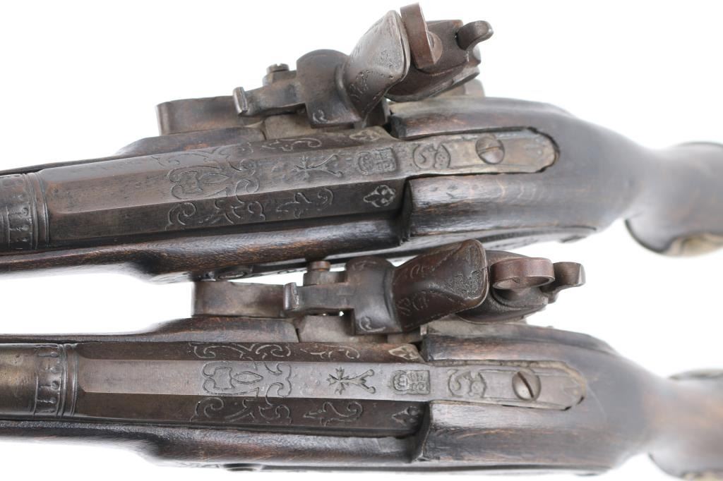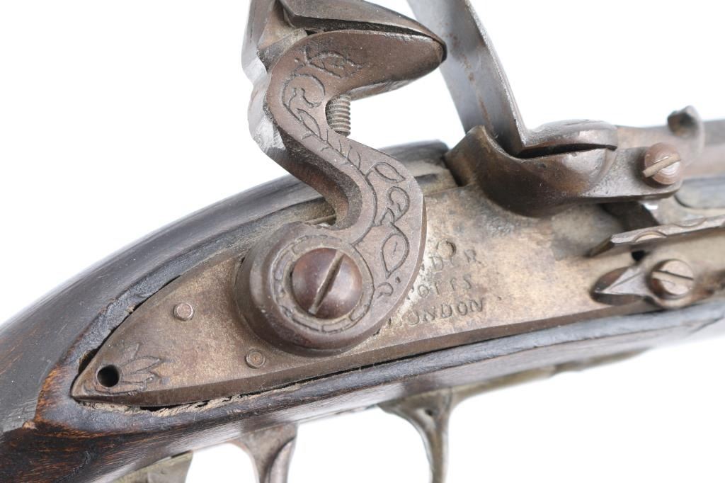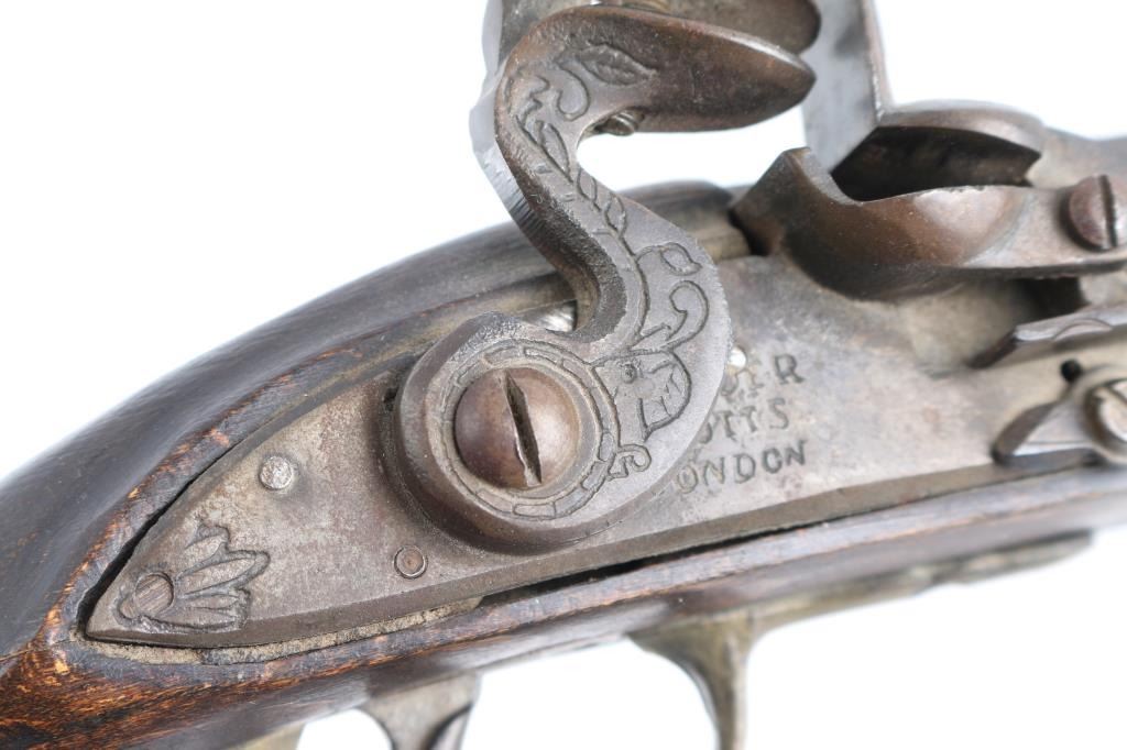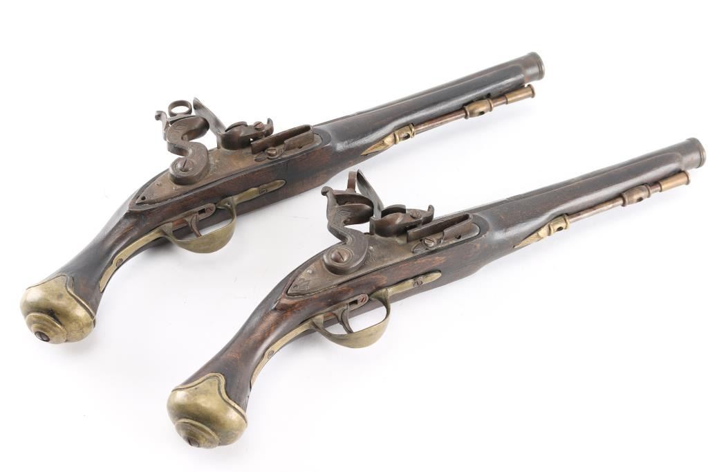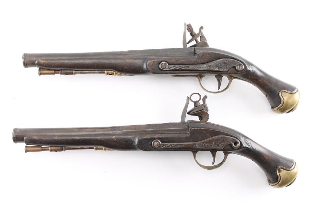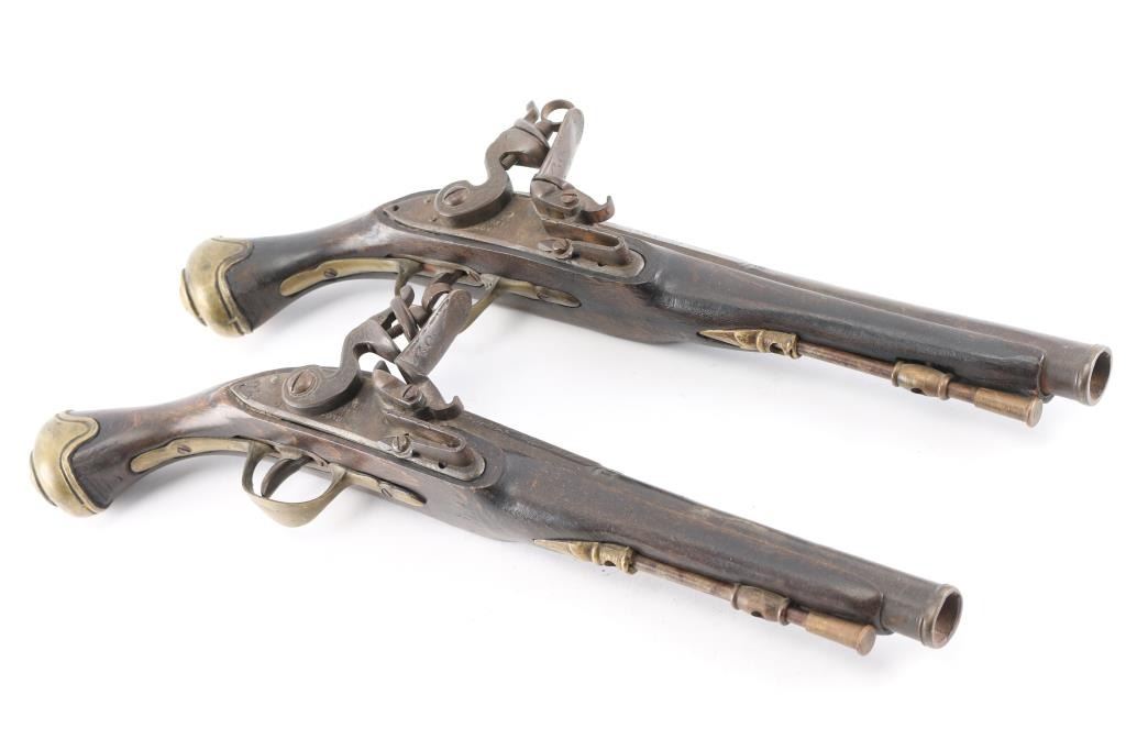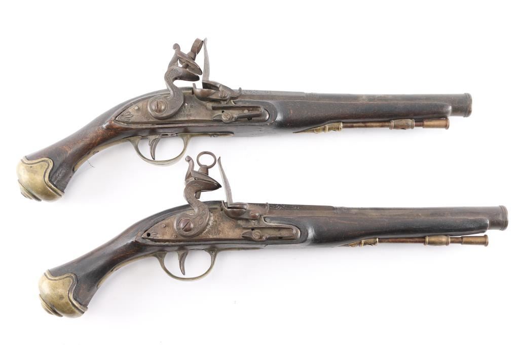 Locks signed "Brander & Potts, London". Obstructed 10" octagon/round barrels, approx .60 caliber. Engraved hammers, & barrels, Brass/metal fittings, brass tipped wooden ramrods. They have a nice aged patina giving them the appearance. of being antique. Would make a great display. **NON-GUN ... DISPLAY ONLY**