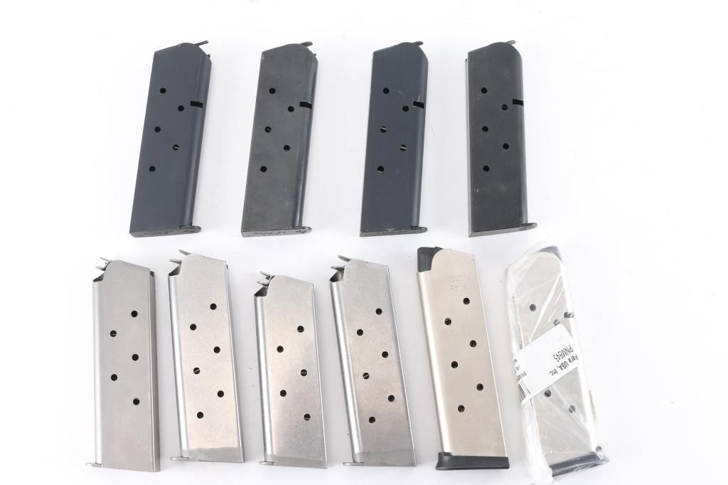 10 total. For 45 ACP, 6 - Colt 7rd steel magazines & 1 - Colt 6rd steel mag; 2 - Para Ordinance 8rd steel magazines & 1 - 7rd steel mag. All in very good condtion.