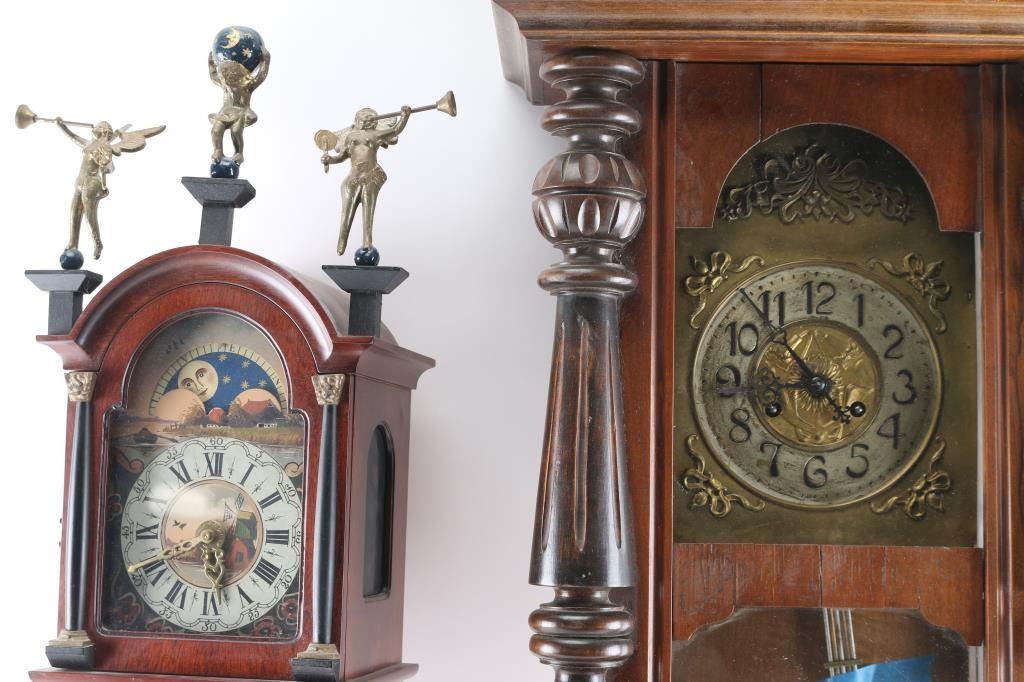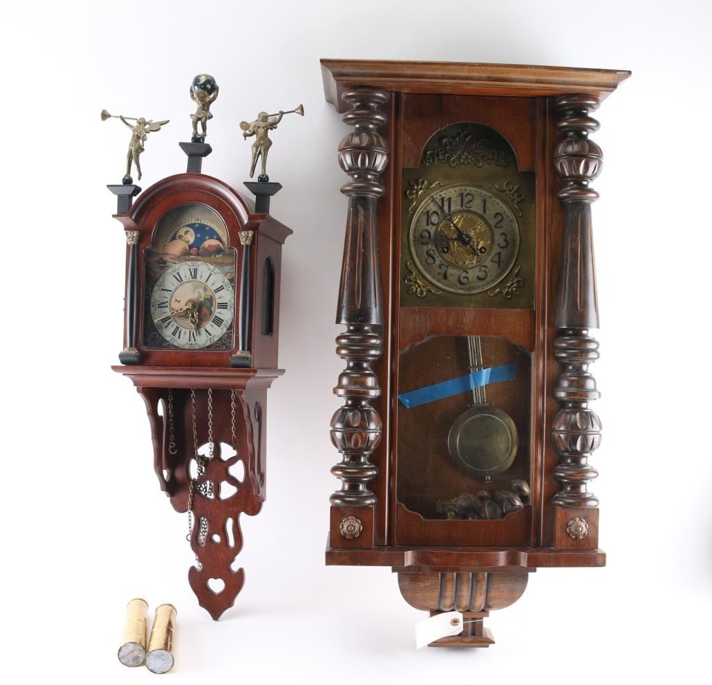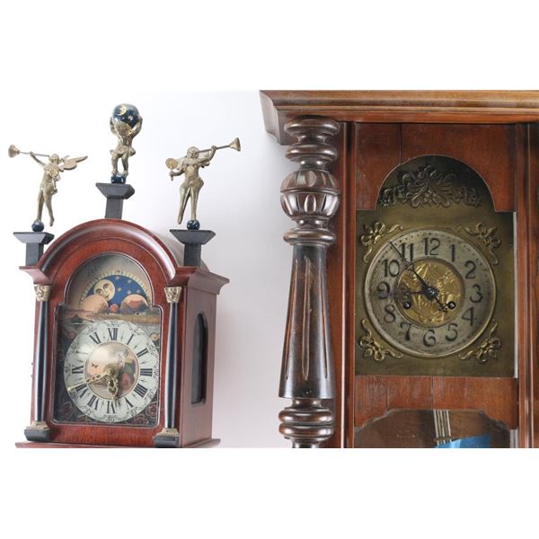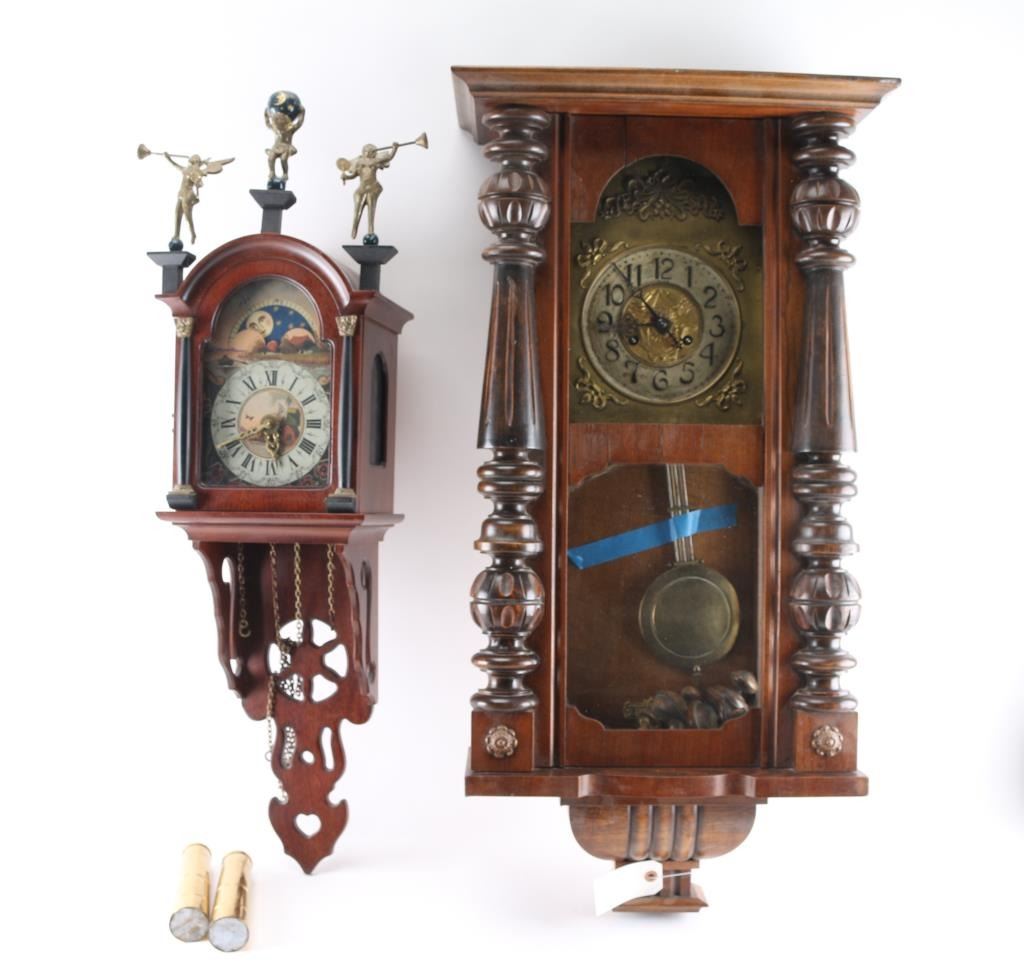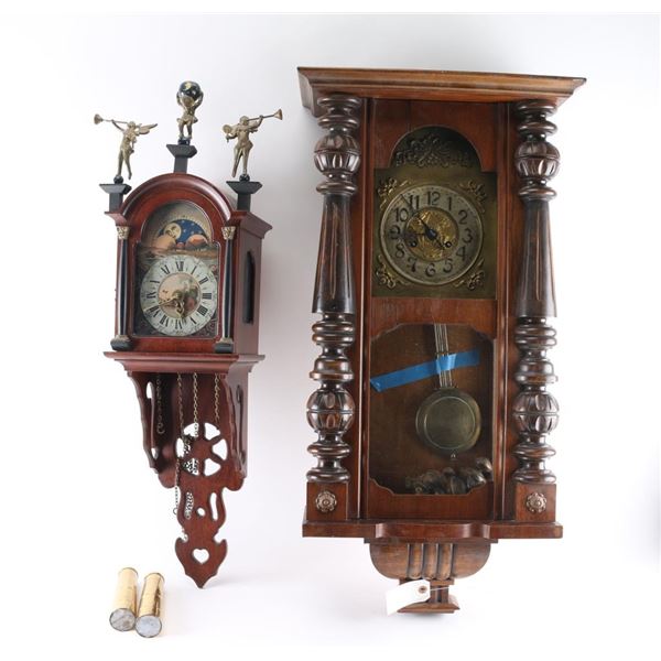 (1) German wall clock w/ pendulum and key. 6" dial. 34"H x 17-1/2"W. (1) Dutch wall clock w/ 3 brass figures, w/ weights, pendulum and key. 5" dial. 34"H x 12-1/2"W.