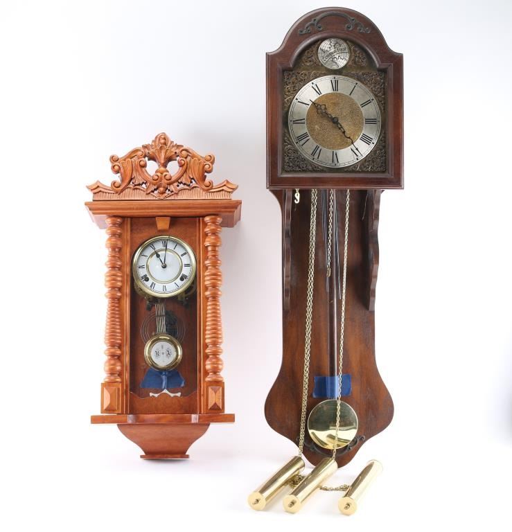 (1) 31 day wall clock w/ pendulum and key. 5" dial. 30"H x 14"W. (1) Dutch wall clock w/ weights and pendulum. 8" dial. 41"H X 12"W.