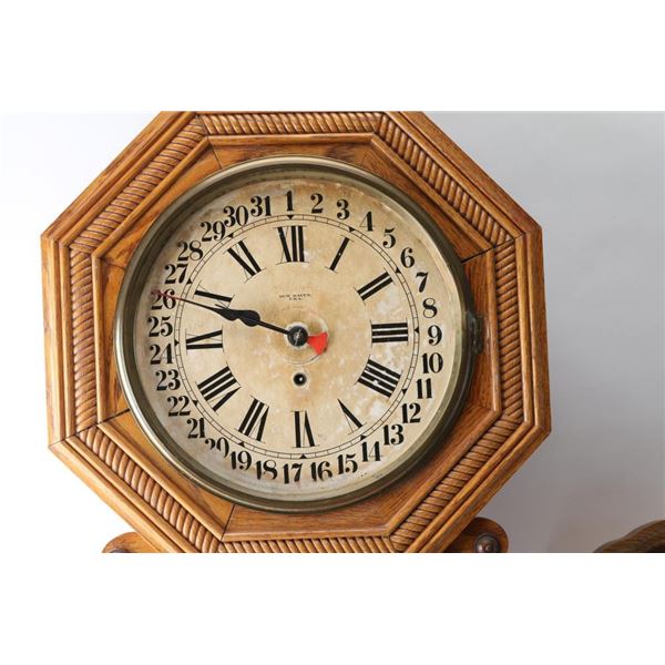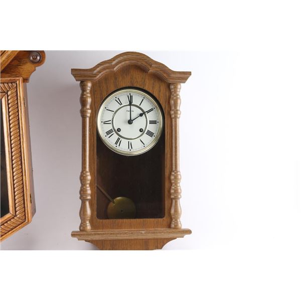 (1) New Haven wall clock w/ pendulum and key. 11-1/2" dial. 33"H x 18"W. (1) Hermle wall clock w/ pendulum and key. 5-1/2" dial. 17-1/2"H x 10"W
