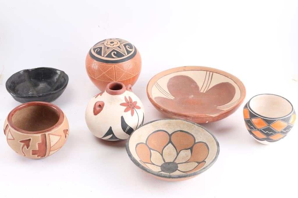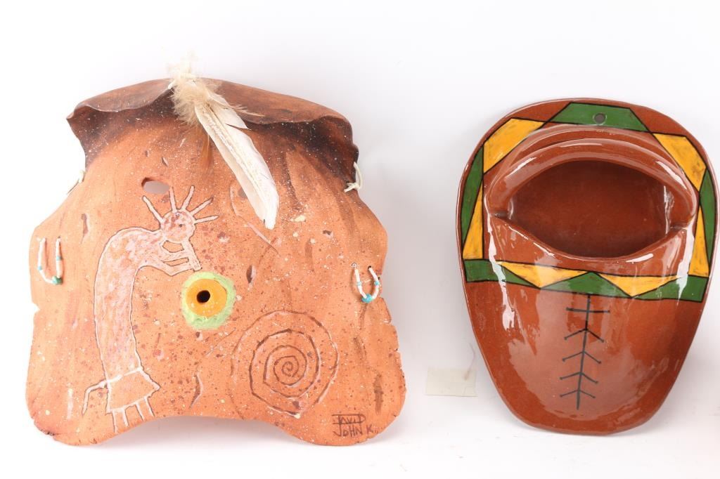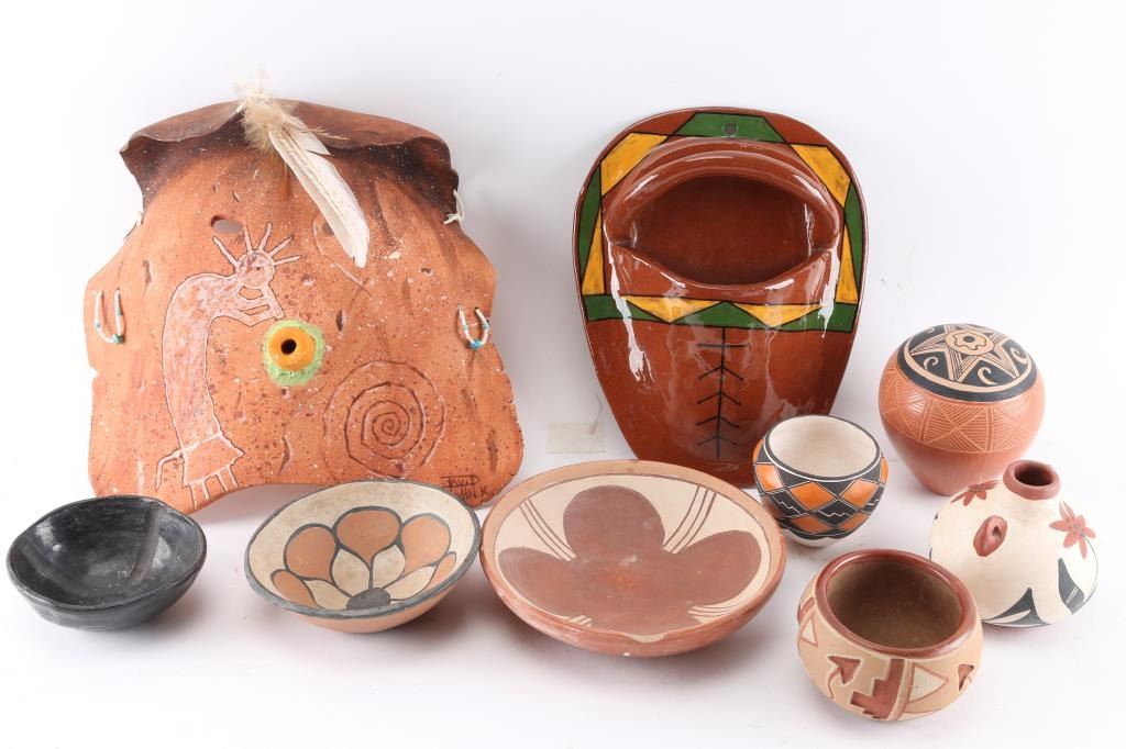 Mudhead wall hanging, Pottery Wall Pocket, and 7 small pots.