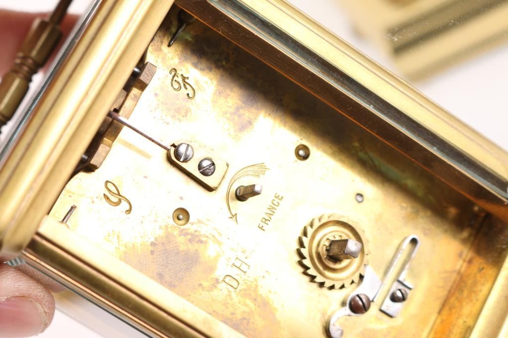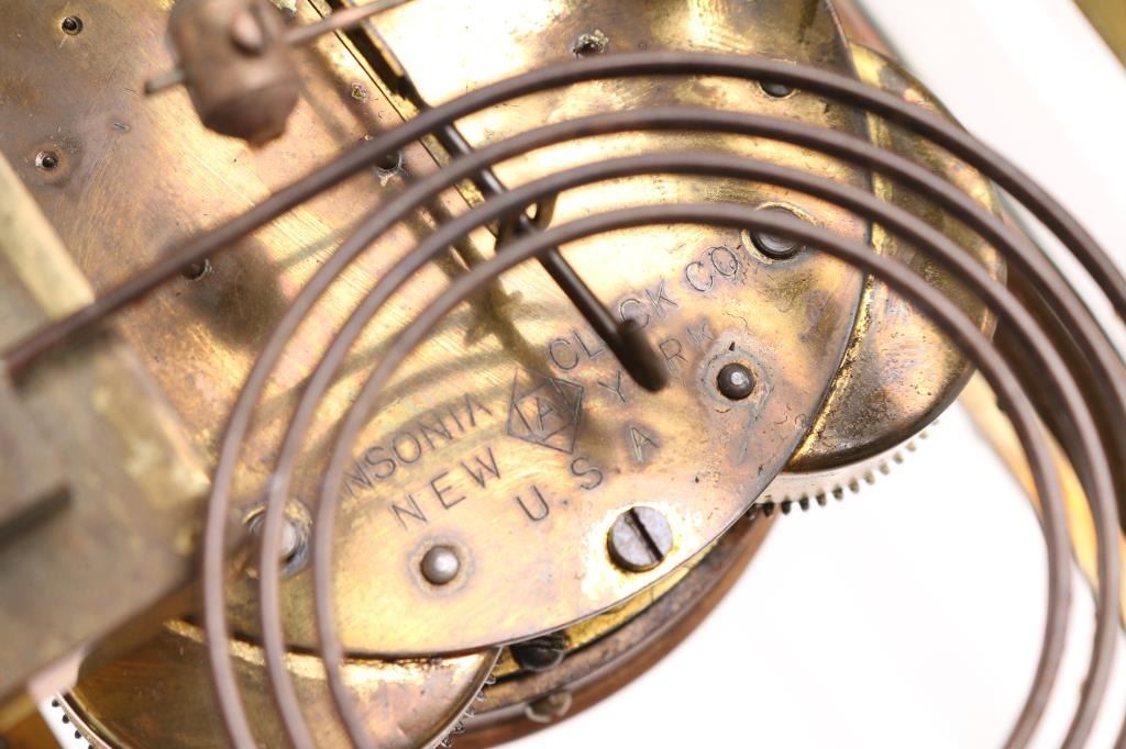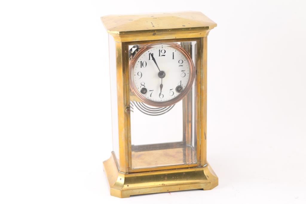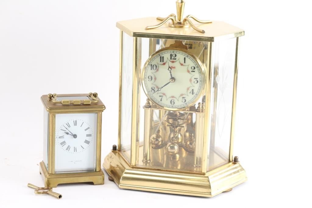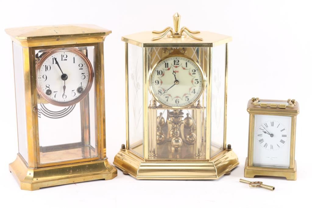 (1) Brass French carriage clock w/ key. 4-1/2"H x3"W. (1) Brass Kundo Anniversary clock. 3" dial. 10"H x7"W. (1) Brass Ansonia Crystal Regulator w/ pendulum and key. 3" dial. 9-1/2"H x 5-1/2"W.