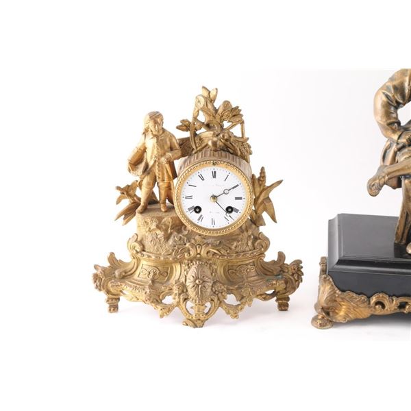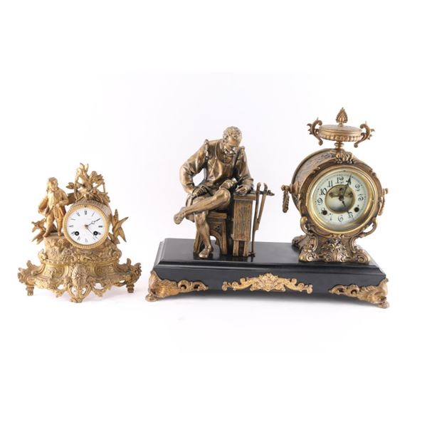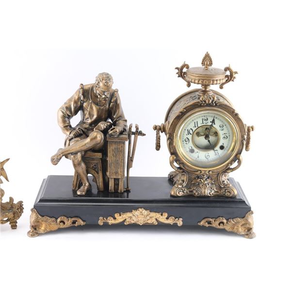New Haven figural mantel clock w/ pendulum and key. Clock needs to be reattached to the stand (screws included). Tyler & Charles gilded figural mantel clock (missing glass face, second hand broken.