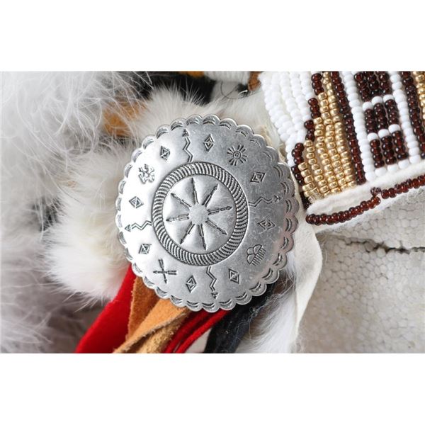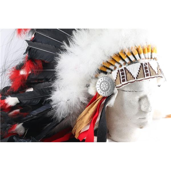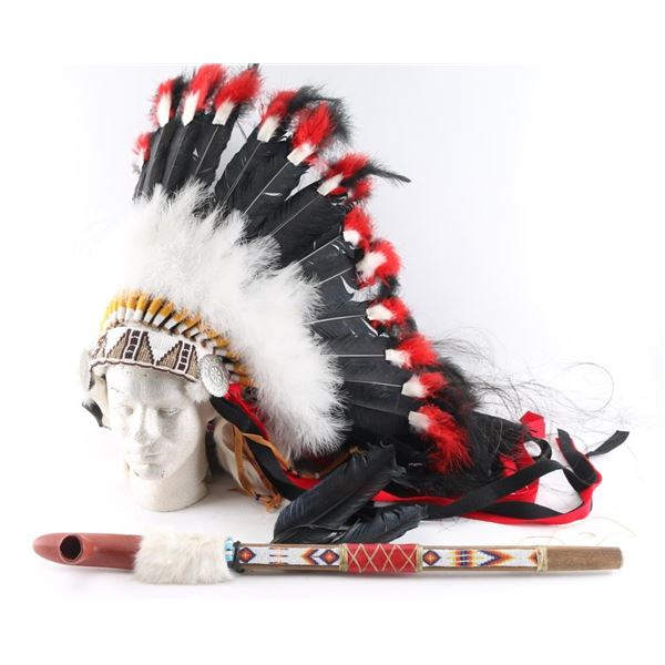 (1) Beaded wood and clay pipe with fur and feather trim, measures 30" long. (1) Decorative feather headdress, with red, white and black feathers, and leather, beads, fur and concho decorations. Measures approximately 27" long.